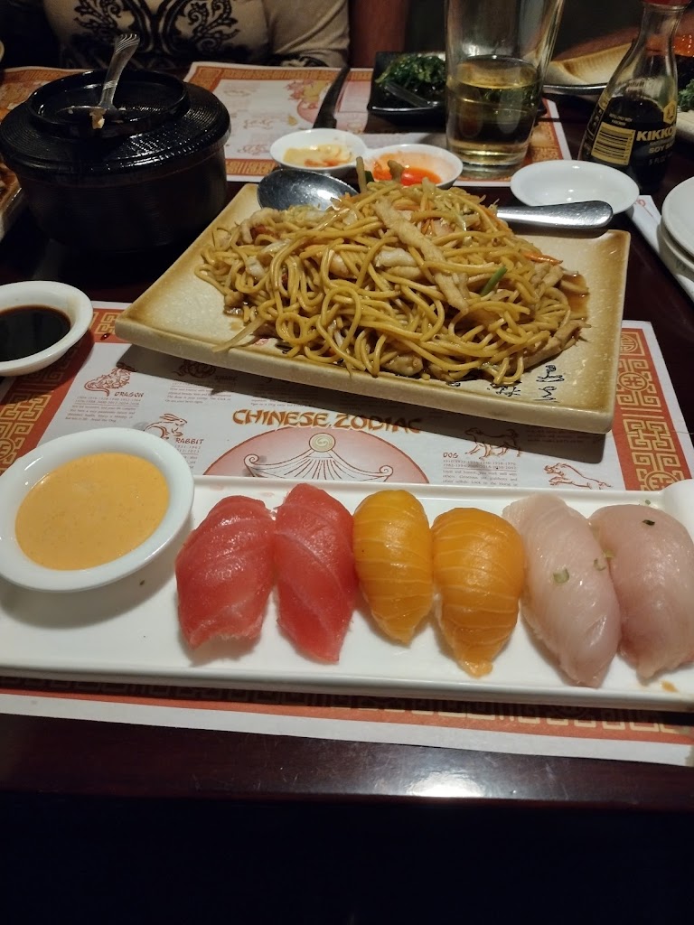 I love Chinese and sushi and had just flown in from Michigan and was super hungry. After checking the area and reviews on here, I decided to check out Chang's and I'm so glad I did. First, the ambiance was gorgeous. The interior was gorgeously decorated, a beautiful giant Buddha in foyer, and 2 awesome fish tanks- one freshwater and the other saltwater. The tables are in these beautiful wooden booths with glass art that makes you feel secluded even though tables were next to each other. They have an amazing sushi selection and authentic Chinese dishes (omg so much better then over processed buffets). I was with my mom so we got a little of everything: Pu Pu platter (which had crab rangoons, egg rolls, beef teriyaki, shrimp and bacon) shrimp tempura)house special chow mein (which is ck, pork, and shrimp), shrimp Szechuan, egg drop soup, nagini- I got tuna salmon and yellowtail , California roll with tempura and seaweed salad. manager visit our table and had a wonderful conversation with him. The next morning when I was getting my nails done and I happened to meet his mom the owner at the nail salon and she gave me the awesome history of them creating that restaurant and taught me about their traditional dishes. She has been rolling sushi for decades! You could hear the love and passion in her voice and I would definitely recommend. The prices are low in my opinion for the quality and amount you get, and was a special experience for my mom and myself.