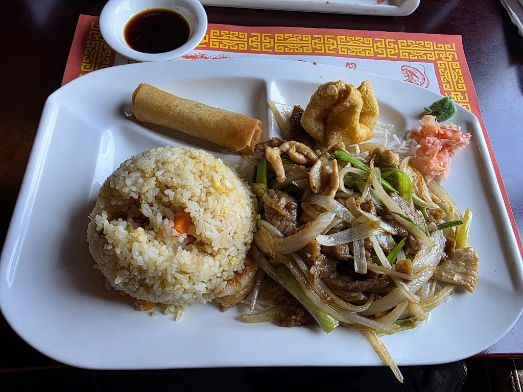 We ordered off the lunch specials and I ordered pork egg foo young. This was not pork egg foo young as I am familiar with. It seemed to be a ball of rice with egg mixed in. The pork was not mixed within the "patty", rather, it was Ramen type placed on top. The familiar looking egg foo young was not what appeared, rather an almost scooped appearance.