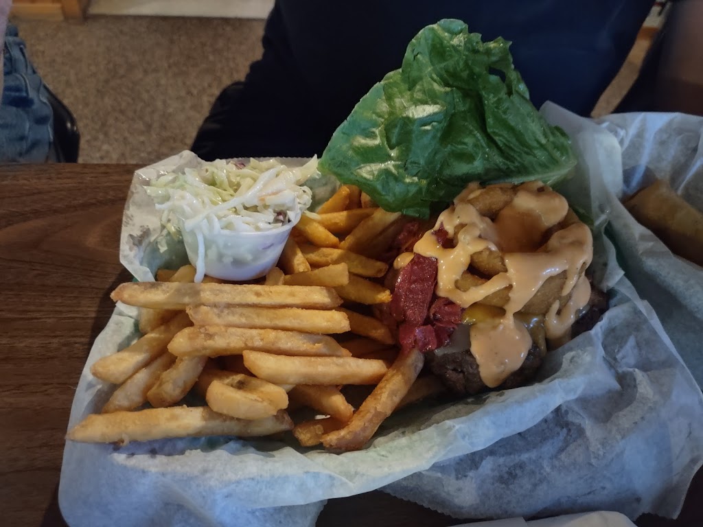 Pretty good food. All you can eat fish fry for Friday is probably the best deal you can get here. Burgers are pretty good,but a little on the small side. Atmosphere and service is adequate at best. Like many places the greatest failing here is that it is a bar first,and restaurant second. Prices are what you would expect from a local bar and grill.