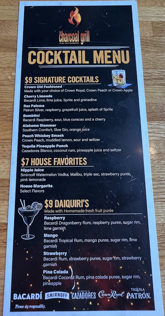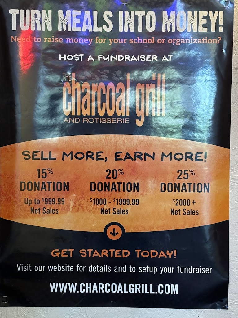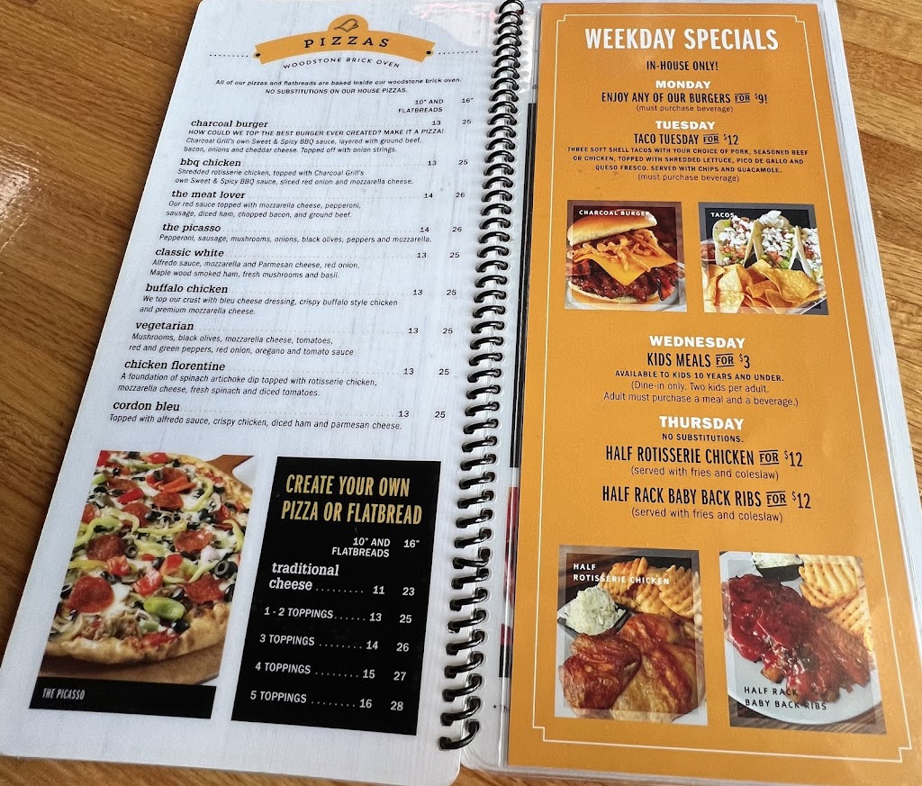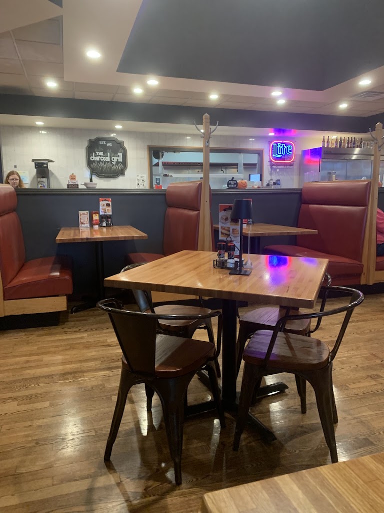 Have not been to the charcoal grill in years seems I kind of forgot about it. Went there the other day and got a harvest salad. It was delicious. They forgot to put the blue cheese in, but they did give me a voucher for another salad at another time. Very tasty and fresh nice clean atmosphere and lots of room. You don’t feel crowded at all. I will definitely go back to the charcoal grill.
