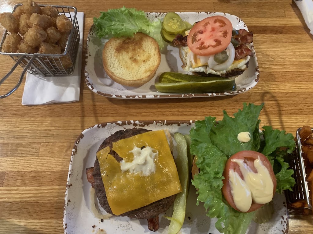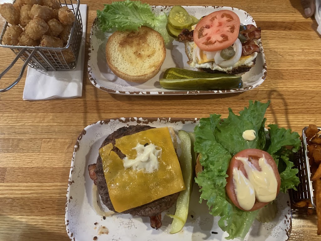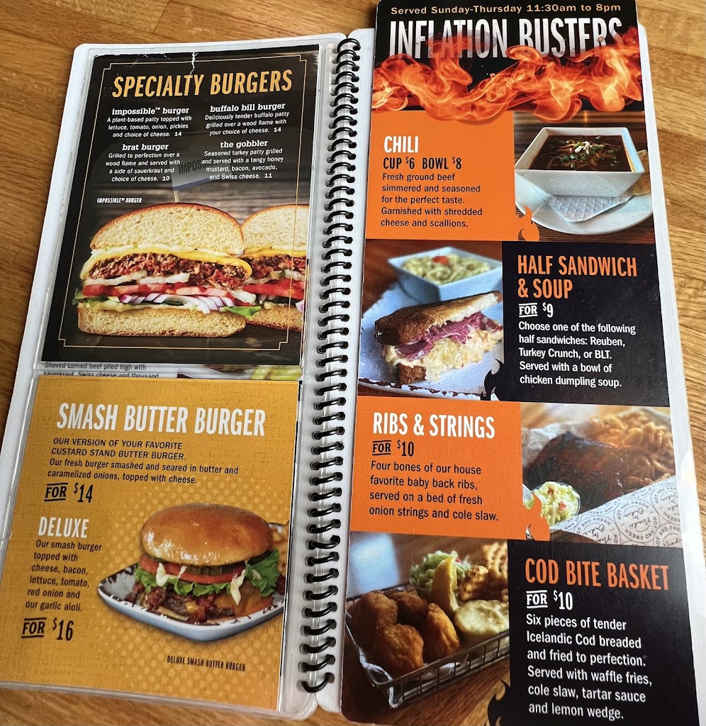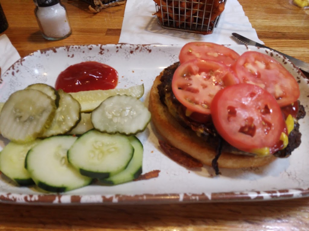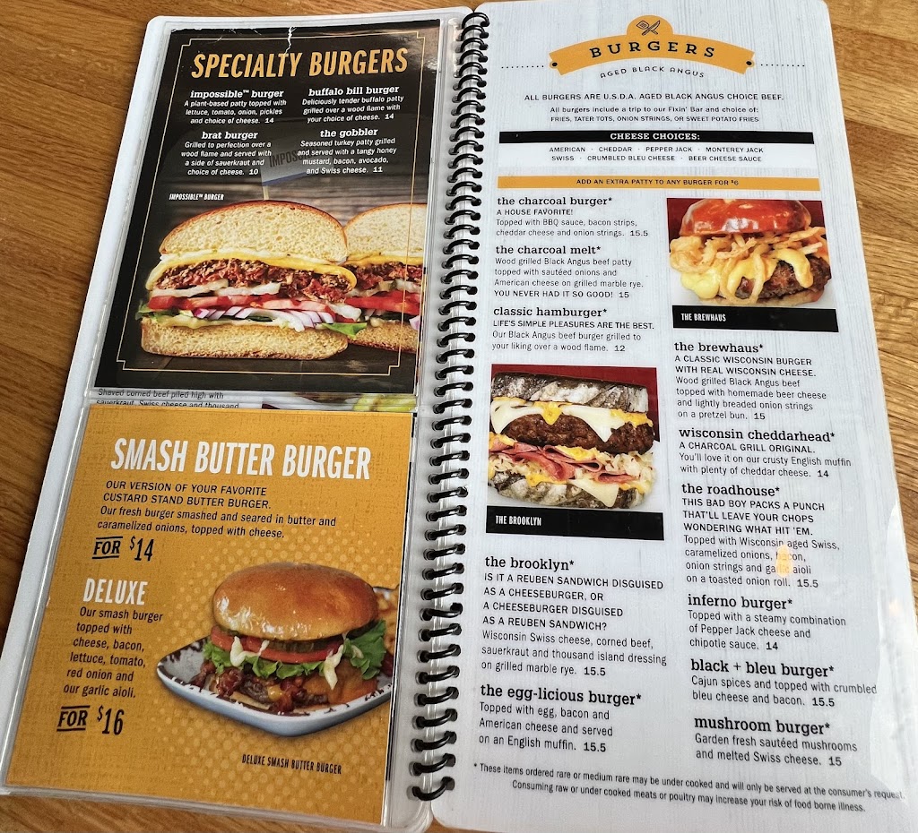 I had the Roadhouse burger. It was fantastic. It was cooked to a perfect medium rare. With a nice chard shell on the meat. Burgers range from 12-15.50.