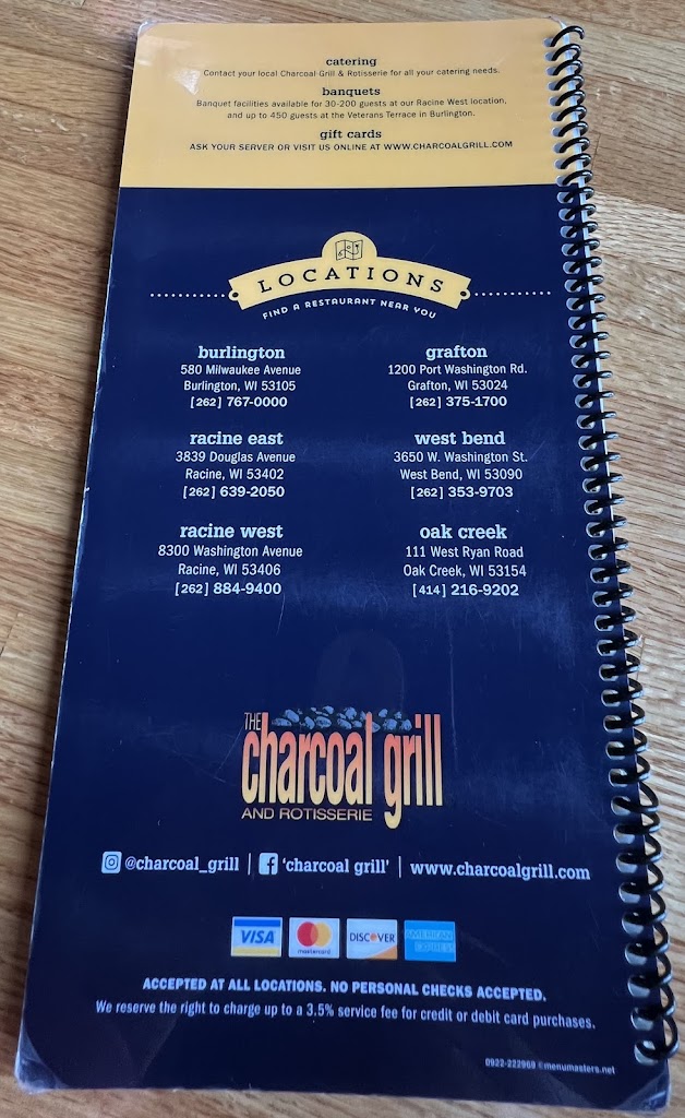 We've not eaten at Charcoal Grill for several years, since the Kenosha location closed.