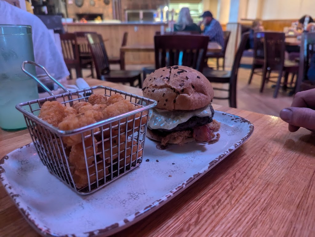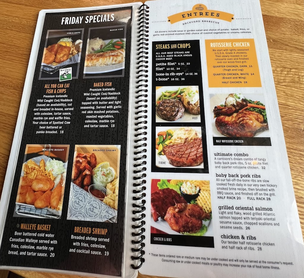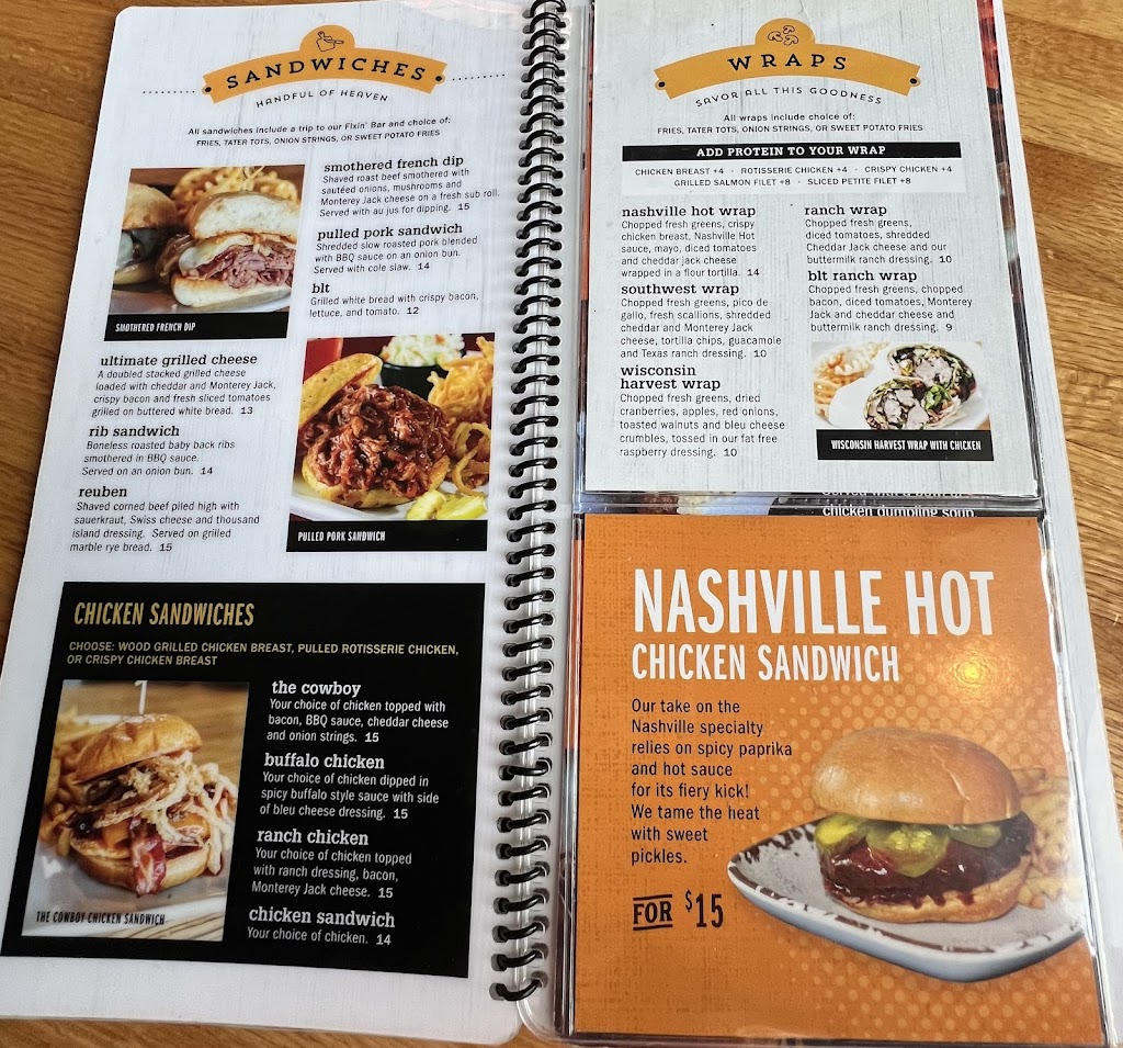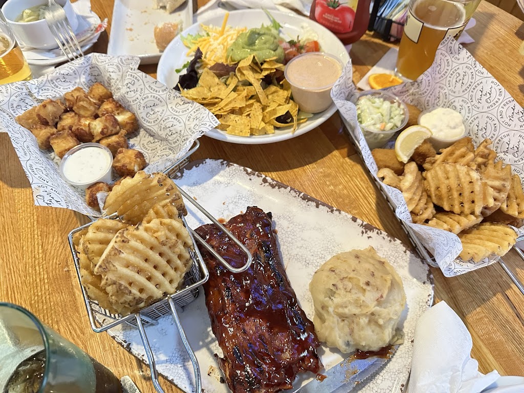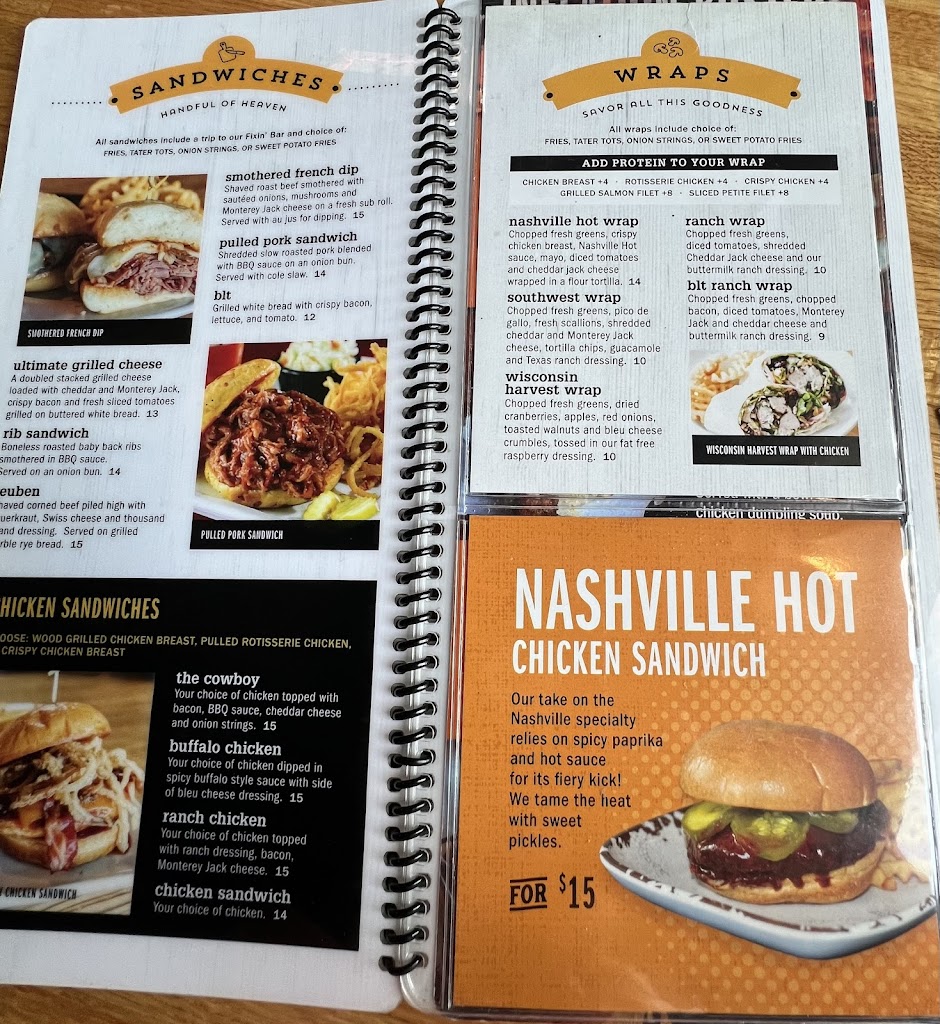 Was in town for a high school game. Large group of us had a late lunch. The servers were really good. Took a little longer for the food even though we had a large group. Southwest wrap was just a wrap. The tater tots were pretty good. Someone in our group had the all you can eat ribs. Said the first batch were dry and the second batch better. The inside looks like and previous Mexican restaurant
