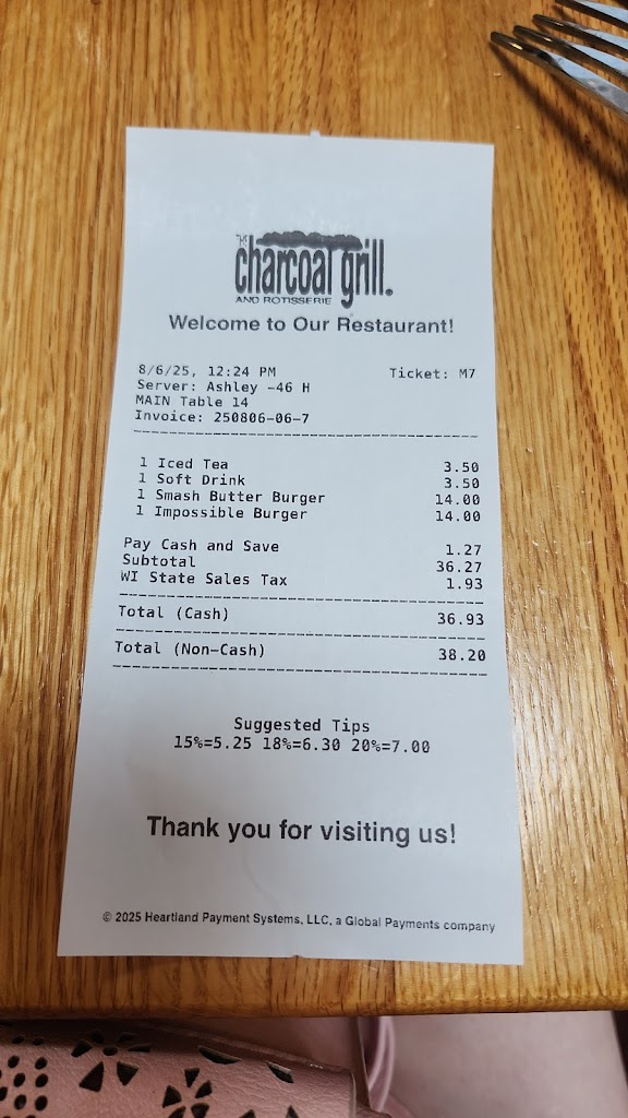 Went here for lunch - two people, each a burger and a soft drink - our bill was $40!! This is Charcoal Grill. Basic burgers. Waffle fries. Fountain drinks. Then they offer their "fixing station", which is 7 different types of mustard, mayo, onions, and two types of pickles. Our waitress was nice. She came to check on us twice. But what I'm most bothered about, and reason for one star is their deceptive billing. If you pay card, they tack on a 2% fee. It says credit card, but this is regardless of it's credit or debit. I used my venmo card, which isn't even a bank or credit card - one that doesn't even charge ME fees if any type! And they do not tell you ahead of time that you will be charged this added fee. So if you don't carry, cash, good luck. I know I never do. This should not be a legal practice. Establishments should not be able to pass their credit card fees on to us.