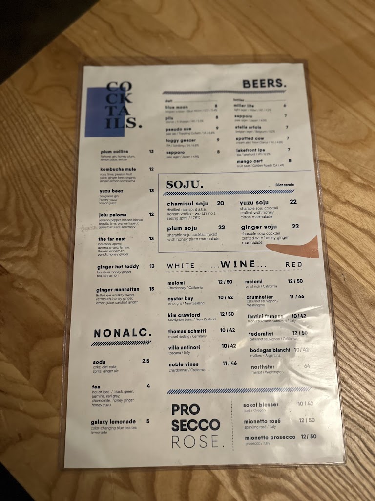 The soju doesn’t taste like soju at all, more like watered down vodka. Food was good and service was solid but the soju was a real mood killer.