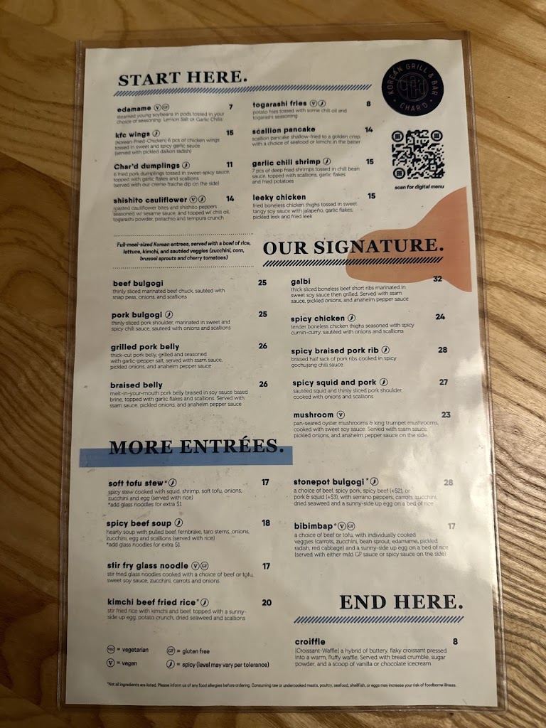 Tried Char'd for the first time with a group of friends after making reservations and man, it did not disappoint! Even the vegetables were to die for. They're a bit pricier than some other local Korean places but the atmosphere and creative touches with the dishes will more than make up for it. Don't forget to try a croiffle (croissant waffle) for dessert!
