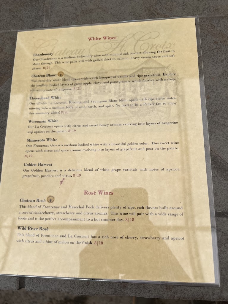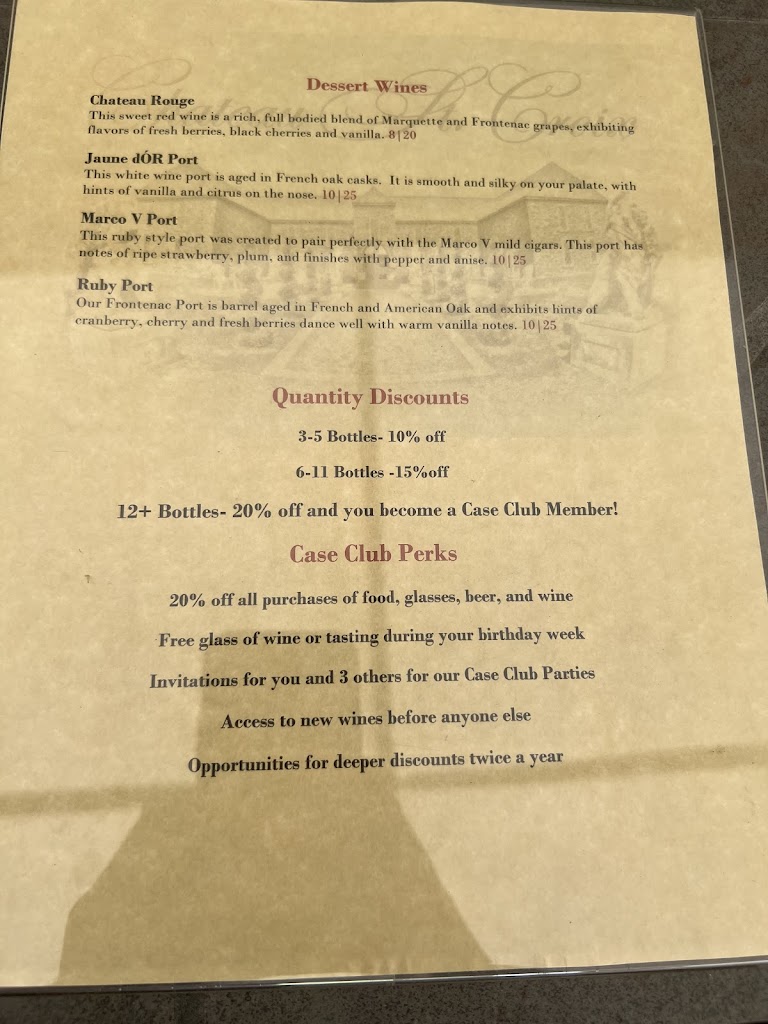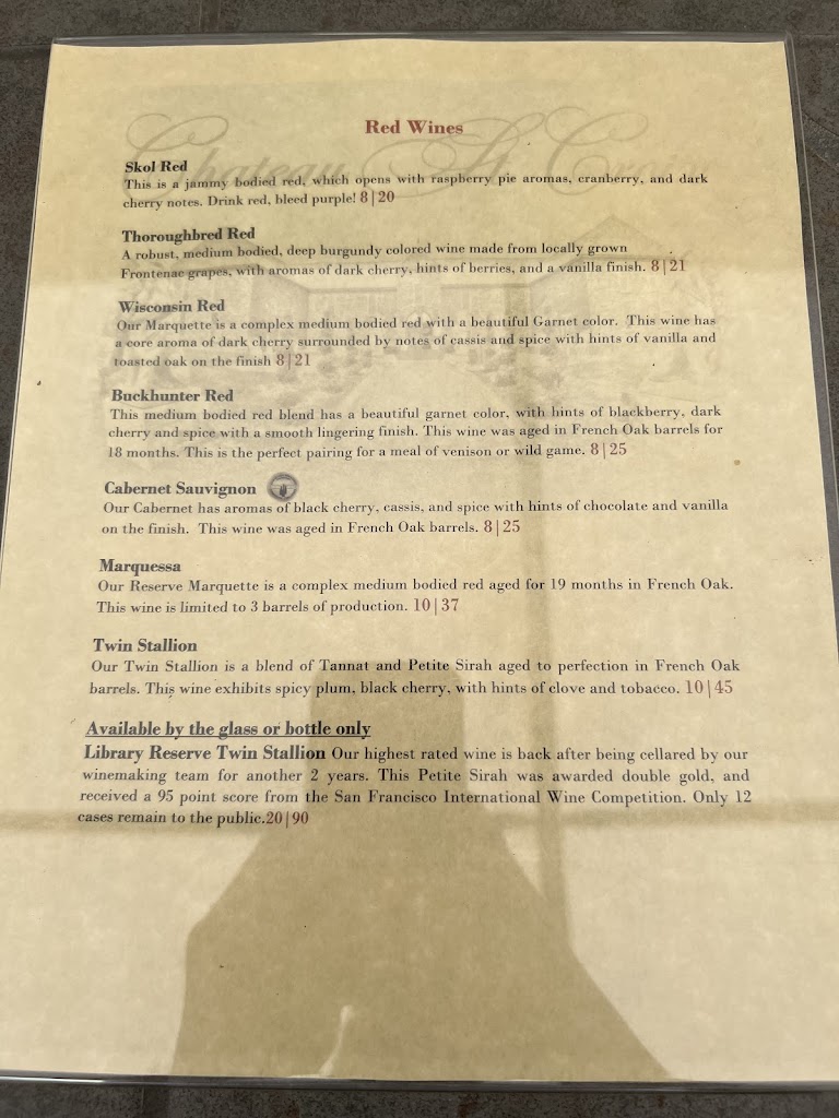 If you’re looking for a winning wine tasting near Minneapolis, I’d recommend the day trip to Chateau St. Croix winery. We had the pleasure of tasting nearly all their offerings and also enjoyed the cheese plate. (The cheese plate had 5 cheeses and was definitely enough for two). For the price it was fantastic, and some of their reds and their ports were very much worthwhile as we ended up purchasing some to enjoy later. Plan to stay a few hours for the tasting. I hear it’s much busier in the summer, but we really enjoyed the more intimate setting the off season provided as well as the one on one conversation with the tasting experts.