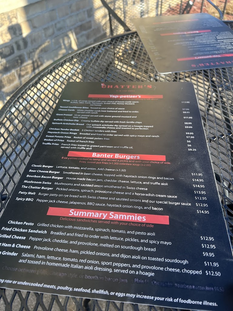 Delicious and fresh! Everything was perfect from the service to the food to the atmosphere! If your passing by or visiting stop by Chatters! Very delicious burgers. We got the Pesto Chicken Sammy and a regular burger with amazing fries!