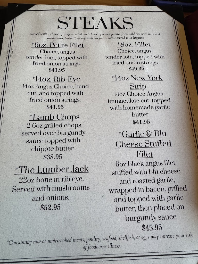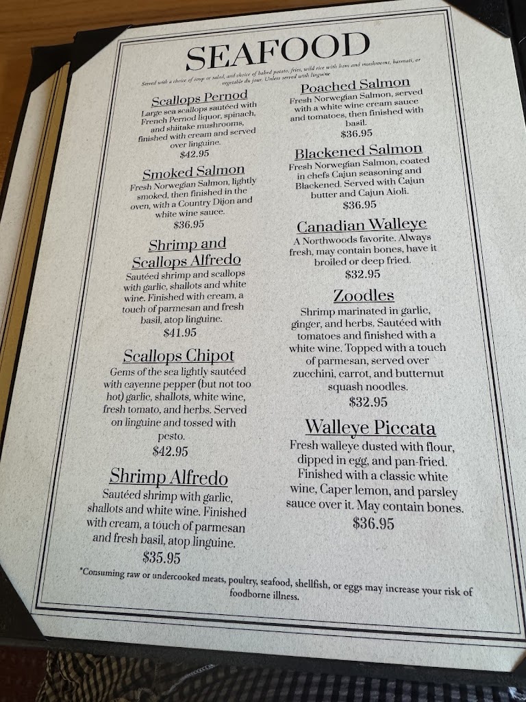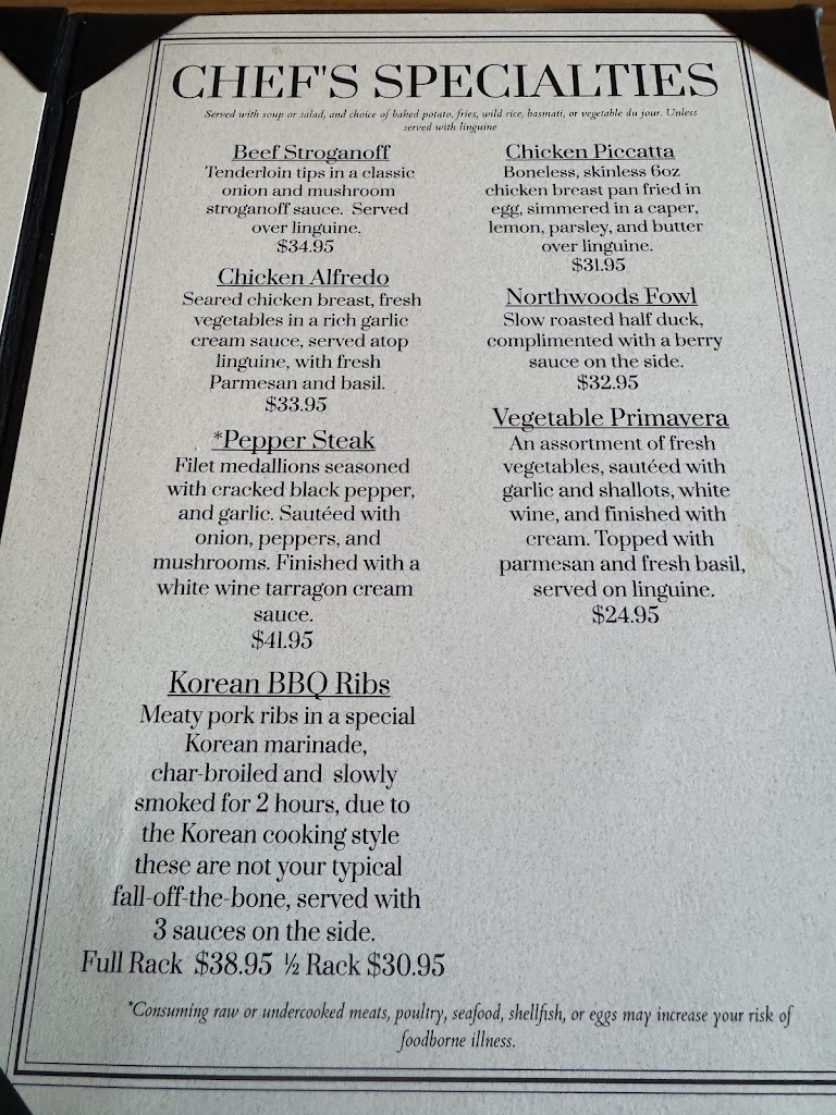 Chef Rene is a wizard with veal. The Veal Forester was absolutely marvelous, and my wife had the Salmon Quinoa which was equally amazing. Wonderful setting for a very nice meal in the northwoods, and the staff was courteous, friendly, and attentive. Chef Rene's father was also wandering around the restaurant and added a wonderful touch of humorous friendliness.