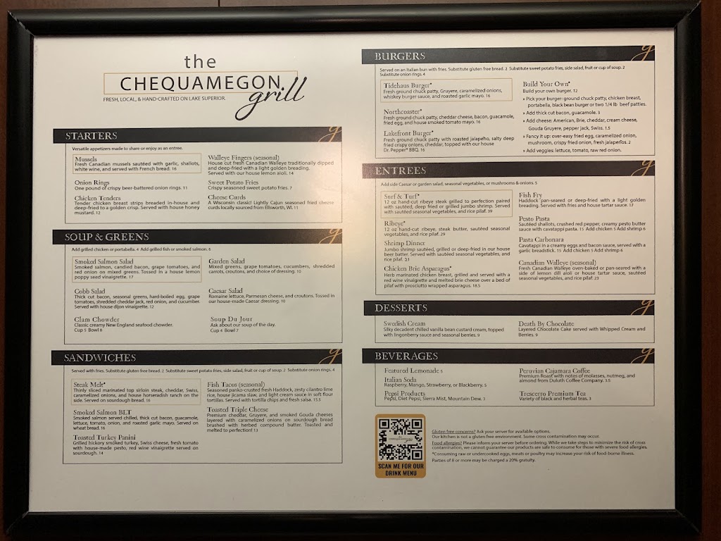 Love the Chequamegon Grill! The food is awesome, drinks are even better, and the service is fantastic! Everyone from the hosts to the server to the bartenders are friendly and helpful. Sam was our server tonight and was so attentive and awesome! We are lucky to have this place in Ashland!