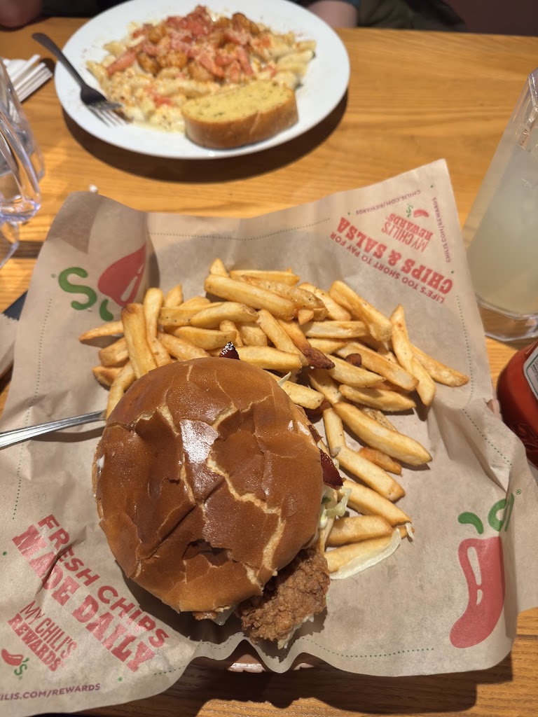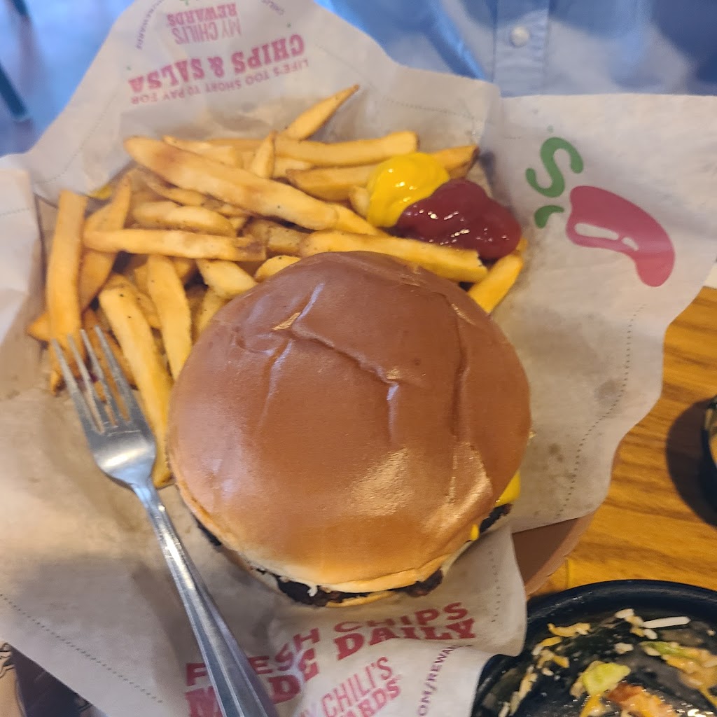 This was my first time having chilis and I must say it will not be the last. We got to go and while they had a full parking lot our food was ready by the given time window. I had a bbq brisket burger and white cheddar mac and cheese. The burger was perfectly GRILLED and the brisket was delicious (I am very picky with my brisket). The Mac and cheese was creamy with the right amount of tang. I don’t know why I hear so many people dislike chilis. I’ve never had their desserts they looked delicious but wow were they pricey.