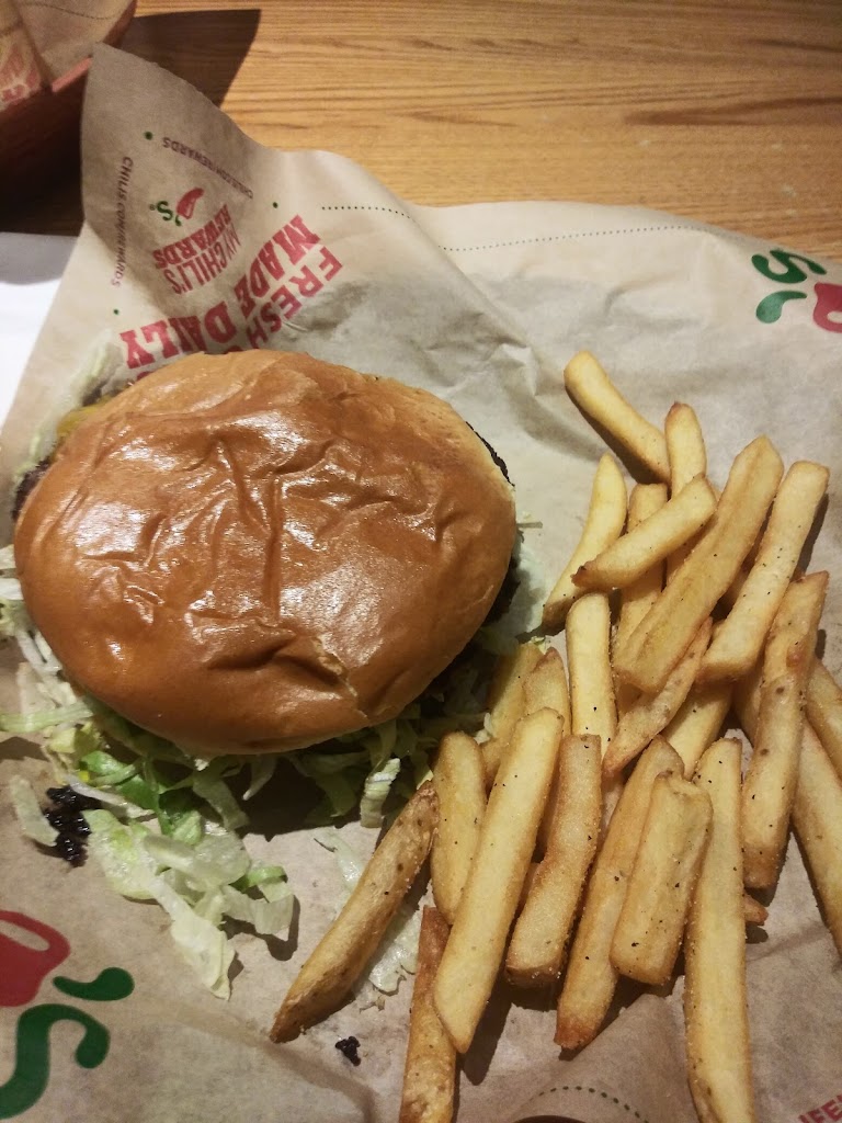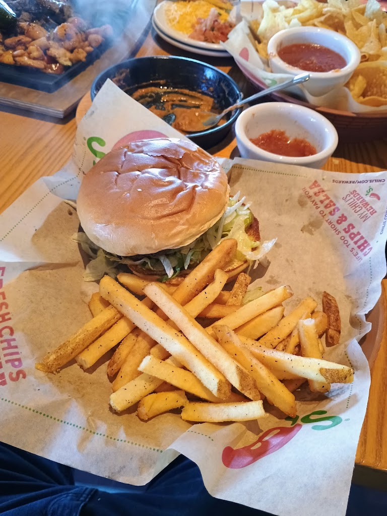 I just really love this place! It has perfectly cooked burgers, perfectly cooked buns, and perfect cook fries. I have been to different chillies around wisconsin, and this is as good as the last one. Whenever I go to chillies I know that I'm going to get quality food, made by people that care about my satisfaction. The waiters are always super nice, and always making sure we are very content and happy with our food. When I was there I ordered a bacon cheese burger and it was soooo good! I could tell that they were really trying to cook my burger to perfection.