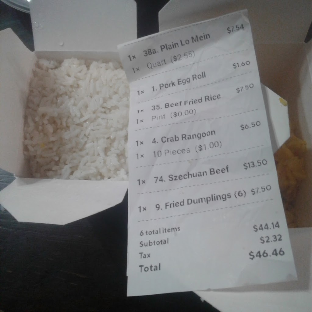 My husband and I ordered $60 worth of food for ourselves, and the amount we got for the price was horrible. Our food came cold, soggy and tasted disgusting. Husband ordered chicken and fried rice. Barely any chicken, missing a pork roll, and his “fried” rice was just flavorless yellow rice. I ordered orange chicken and white rice. My white rice was the only thing in our whole order that was warm. My chicken didn’t taste like anything, and was soggy and just overall disgusting. The pork rolls and crab rangoons that we did get were basically just fried outside with almost nothing in the middle. Never will be ordering from here again. We should’ve ordered pizza.