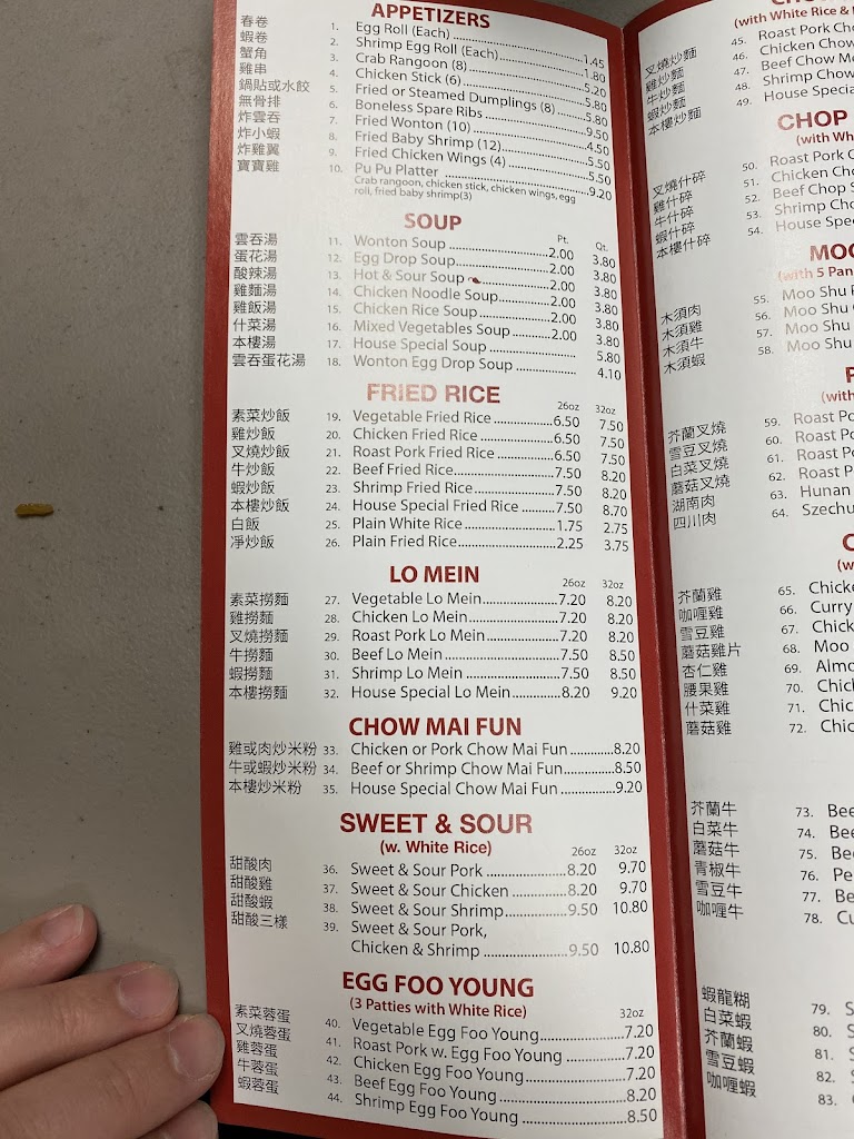 This is a chinese take out restaurant. And I Regularly order crab Rangoon, sweet and sour chicken, pork egg foo young, beef and broccoli, vegetable lo mein, vegetable with bean curd, pork and vegetable fried rice. There seems to be newer staff lately(last year maybe?) but it's due the better. Orders are completed faster and the fried items are less greasy. Seems to be the same materials, but better prepared. And the kitchen is noticably cleaner. Love China One