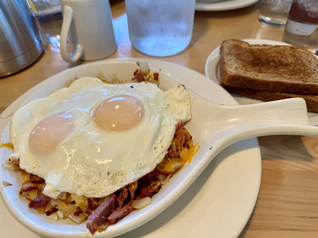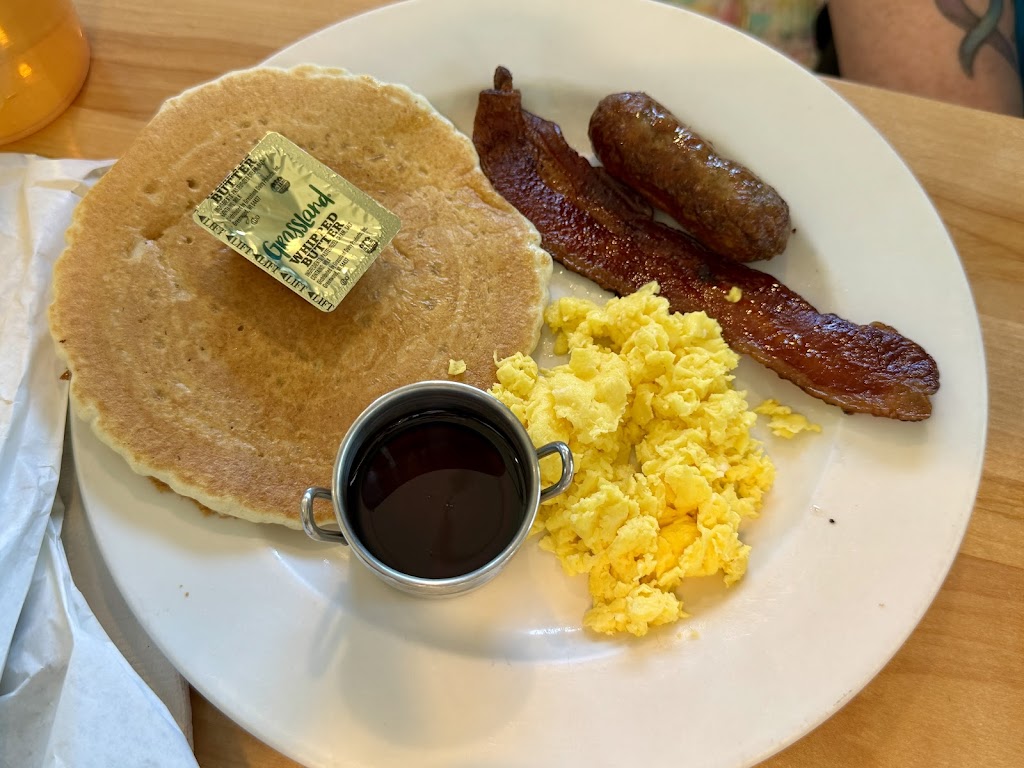 Good breakfast, served quickly. Eggs Benedict was plentiful and tasty. They leave a coffee pot at the table, so you don't have to wait for refills.