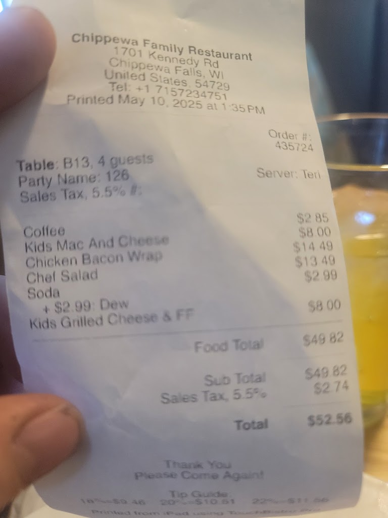 The owner of the family restaurants also has other family restaurants in our community Chippewa , Altoona and Eau Claire . No matter what restaurant you are at you know you’re going walk into good atmosphere hard workers and extremely good food. Don’t just take my word for it. Give it a try.