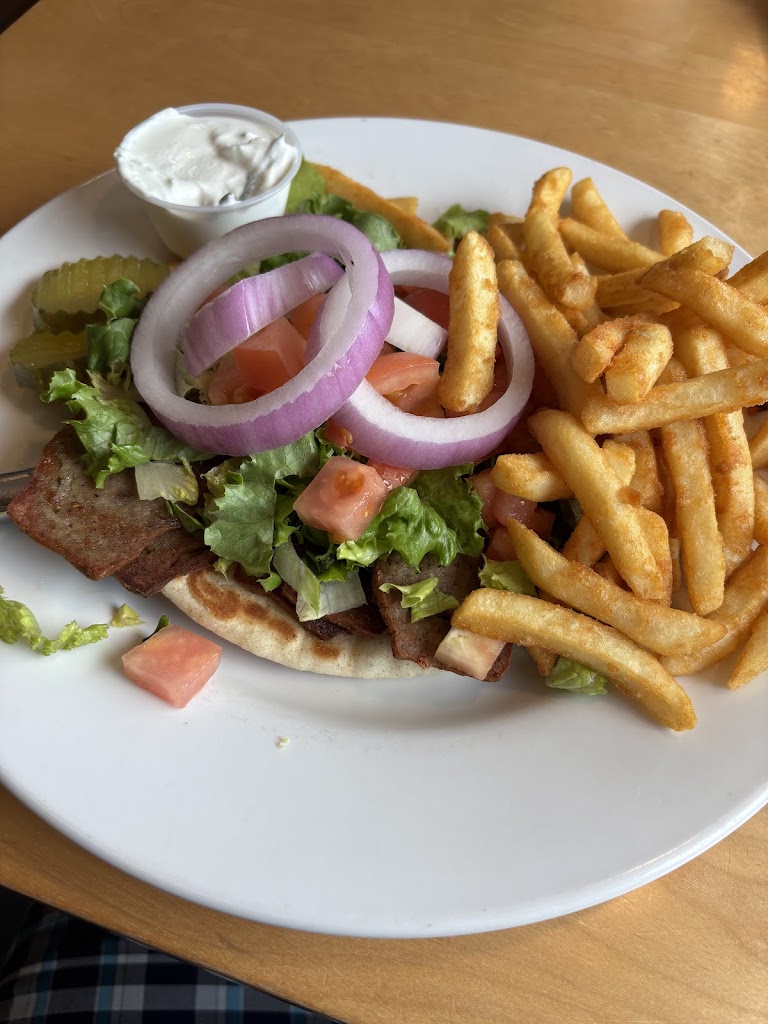 Don’t order a Gyro ! They are huge but also overpriced and subpar. The Gyro is made form a huge amount of those thin strips of meat that resemble turkey bacon like you get in a cheap Gyro kit at the supermarket.The thin meat was overcooked to the point of crunching when you bite into it but there was a ton of it. The sandwich comes with a very small amount of the usual veggies and a single portion control tub of Tzatziki sauce. I asked for an additional tub of Tzatziki to attempt to make the Gyro somewhat palatable and was charged extra for the condiment. My wifes food was very good , I should have had a burger !