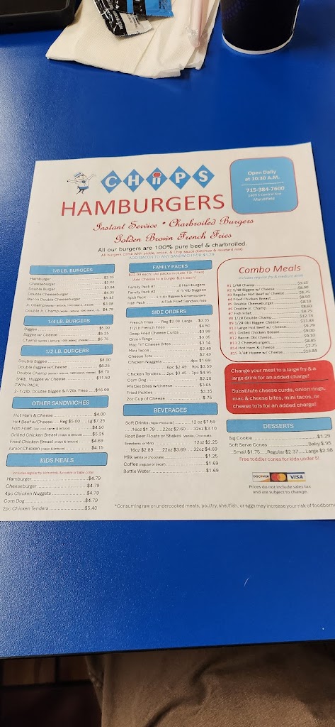 I have never had a really good cheap double cheeseburger in my life until I found Chips. The burger was outstandingly tasty and affordable. The place reminds me of one of those old fast food restaurants in the past and made me feel nostalgic in a good way. After a good meal I wanted to try their soft serve ice cream cone. That was probably the best part after my meal. It was very creamy, had a great vanilla taste, and had a nice presentation when it was given. Sadly, I'm not originally from Wisconsin, but if I were to visit the city of Marshfield again I would definitely grab a bite at chips when I get the chance.