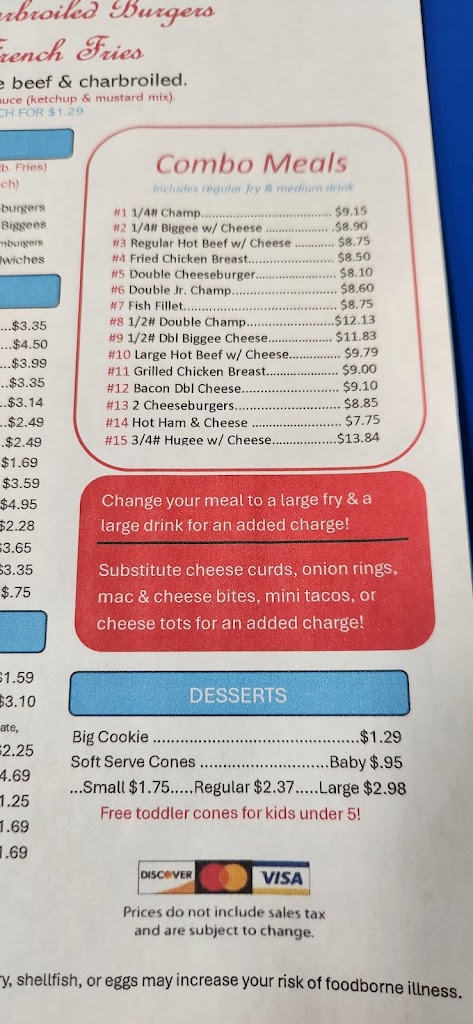 The prices are getting pretty crazy. I used to be able to go there and get 10 cheese burgers And french fries for like 13 bucks. Now 10 burgers and a large drink is 28 bucks. Sad I can go eat at McDonald's cheaper.