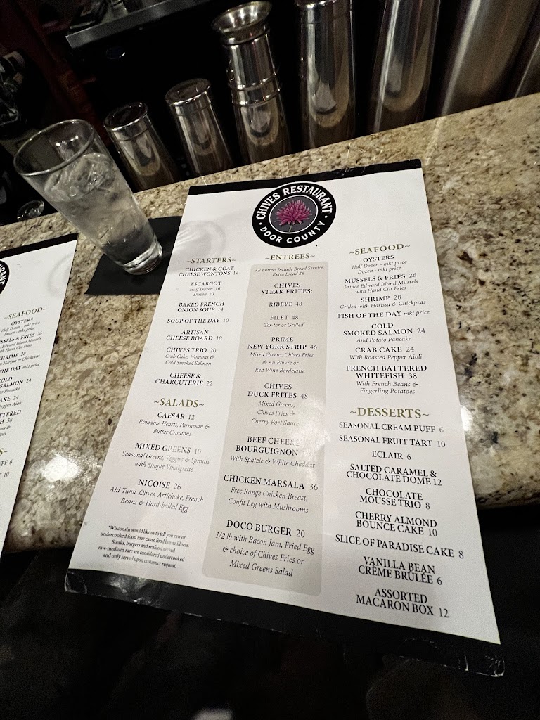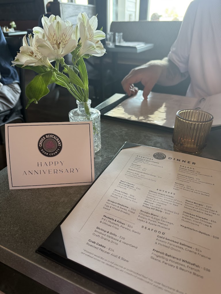 We thoroughly enjoyed our time at Chives! Carlton our server was friendly and attentive. Both of our steaks were cooked to perfection and the ambience was pleasant. The staff gave us a card for our anniversary which was a lovely touch. It was definitely our favorite Door County dining experience.