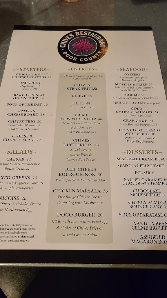 For years Chives has been one of our favorite destinations when in Door County (which we visit often) but tonight our experience resulted in deciding we would not done here again. We sat for 20 minutes before a server even came to the table, ordered a half dozen oysters to share and they were delicious but whoever shucked them did not cut the muscle attached to the shell which made them a bit difficult to eat and unable to eat the entire oyster. They were served without plates, crackers, or fork for eating. We both ordered the whitefish which, once again, delicious but the green beans were uncooked (tough and cold) the the sauce was scarce and broken. Our Server never came back, let alone check on anything. One of the other servers cleared out plates and another just a few minutes, offered us dessert menu which we ordered from. This server, while not responsible for our table was wonderful! We sat for another 15 minutes and finally the desserts were served. They were also fine but the lack of service and the kitchen missteps means we won't be back! It certainly was not a $175 meal!