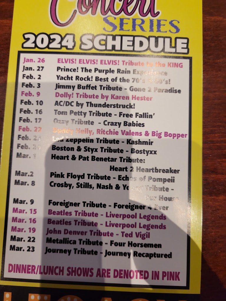 What a nice afternoon. The food was wonderful and the show was great! Very good table service. The staff was awesome! Highly recommend.