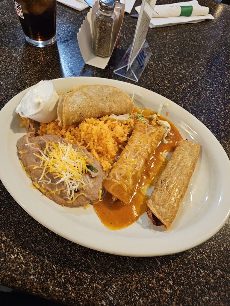 This was our second time visiting this location. We ordered 2 taco dinners, asked for all the toppings, didn’t receive what we asked for. Added a big chicken burrito before leaving, it was small and was chunky beef instead of chicken, we also ordered 2 small chimichangas to try, they were good but small as well. The server was on his phone and not very attentive.