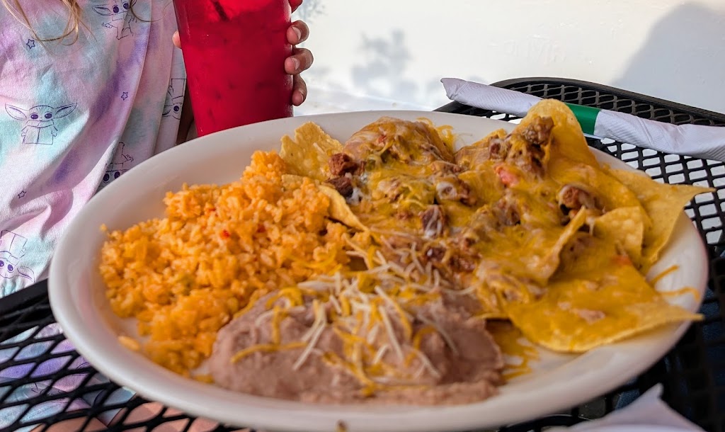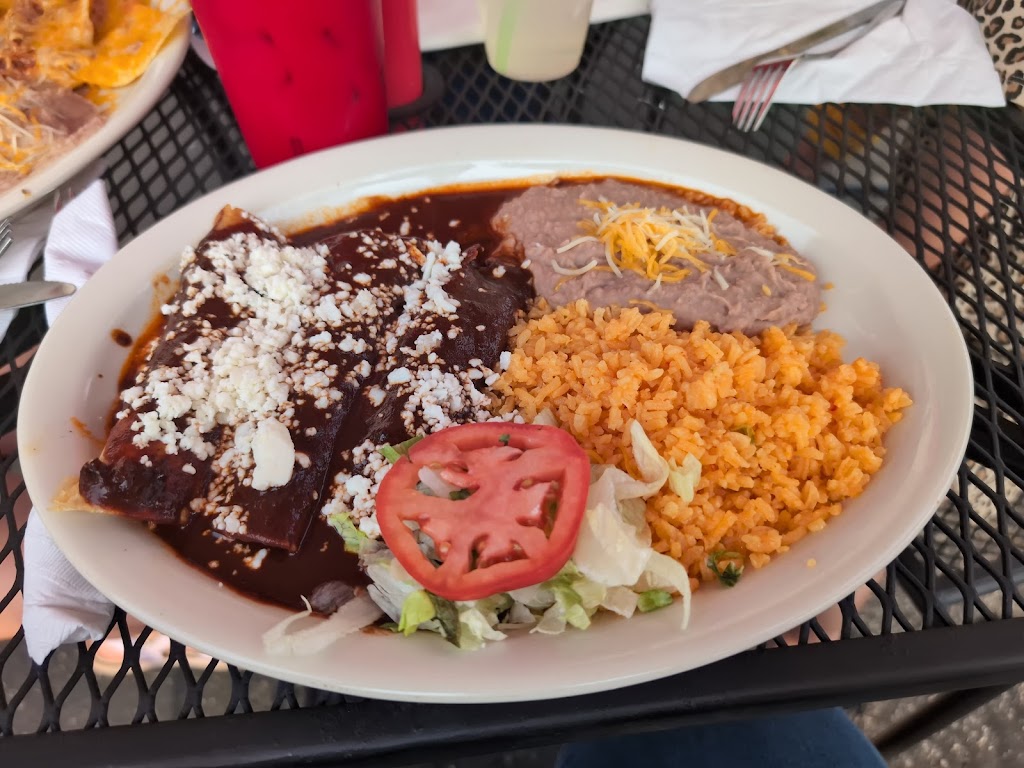 Prices are a little high so one star off (especially when compared to Mara's across the street), but service and food were good. We ate outside which was nice. Kids meals are $10, the one with nachos supreme and rice and beans was a large portion and good, the kids cheeseburger was nothing special and therefore overpriced. I had the chicken mole enchiladas which I enjoyed, all moles are different and I would order these again. My mom got the 2 chimichanga dinner, was large portion and she liked it. There horchata was also really good.