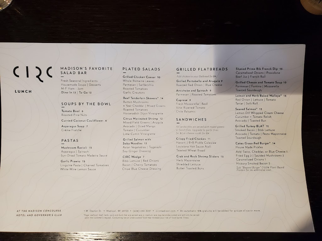 Very much a hotel restaurant, don't expect to be blown away by the menu. On first sight the menu looked quite tasty, but our proteins were both overcooked, and the rest of the dishes just lacked some punch. There are just too many other good restaurants downtown Madison to justify a trip back
