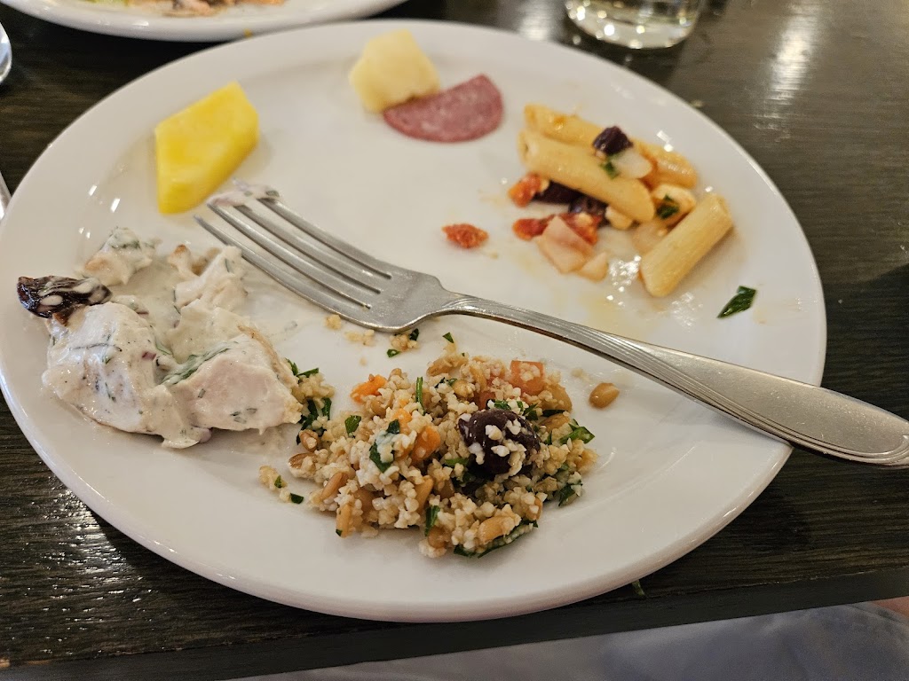 Took my daughter who is a swimmer. A wonderful selection including various proteins. The salad bar was fresh and beautifully presented. My daughter really appreciated the lentil soup, edamame and red beans for the salad, lemon orzo salad and bean salads. It was a swimmers happy place.