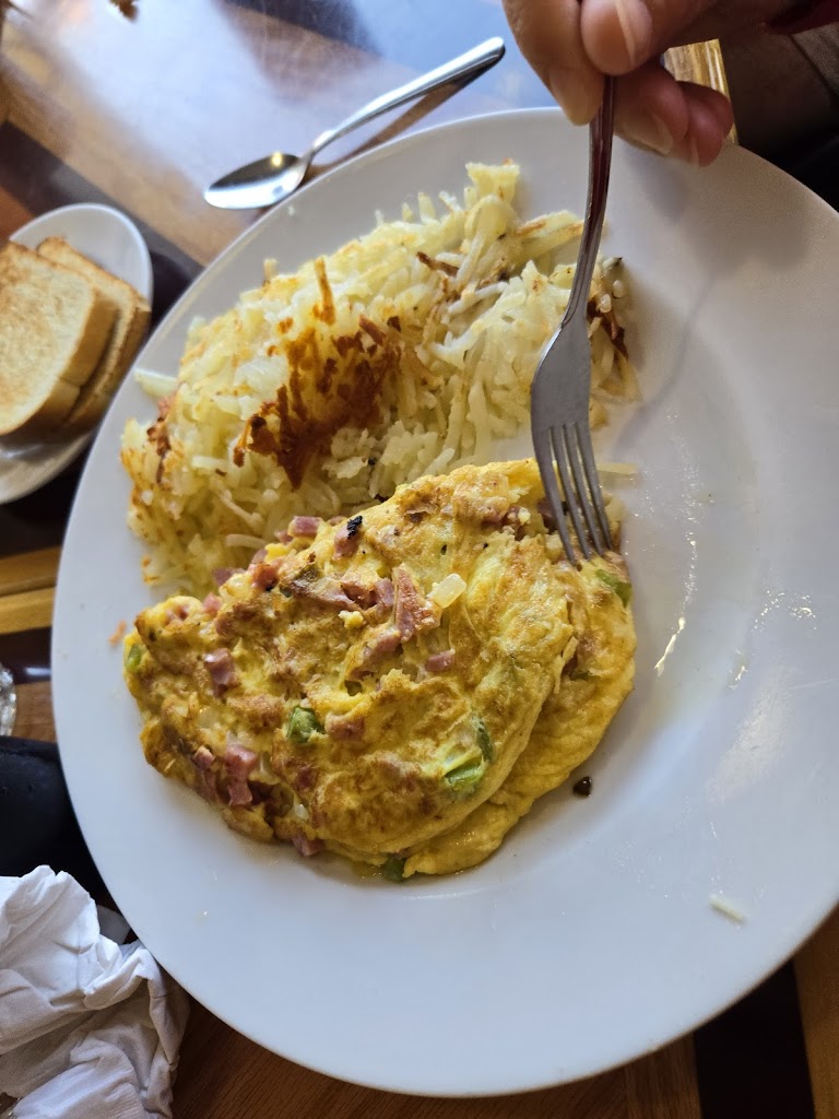 Fluffy omelet is tasty and huge. Fast service. Nice staff.