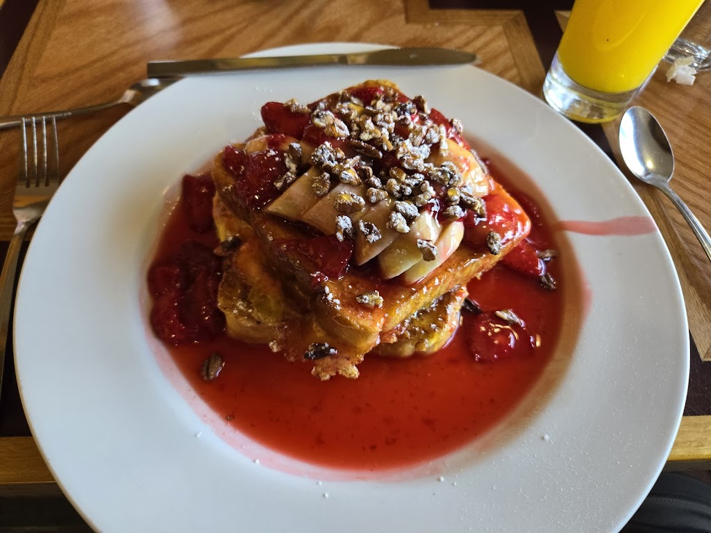 The strawberry stuffed French toast was amazing. It's not what I ordered, which was regular stuffed French toast, but it was great! My wife loved her omelet. The breakfast burrito got a really good review, but the bloody Mary was sub-par.