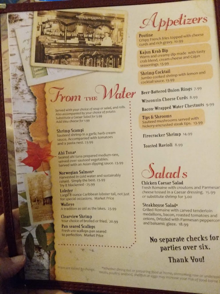 Quintessential N Wisco supper club, done really well for 105 years. Ol' Fashioneds, steaks, ribs, seafood, and more. Great atmosphere, wood interior and bar. Great service which is saying a lot post-COVID and in a small town with a limited labor pool. Seven of us enjoyed the experience, vibes, and food. The cognac steak sauce is just a shot of cognac warmed up, not a reduction or cream sauce which would be much better. But we loved our steaks, scallops, ribs, ravioli, baked potatos, au gratin, soups, and desserts. Will definitely come back here every time we come up north.