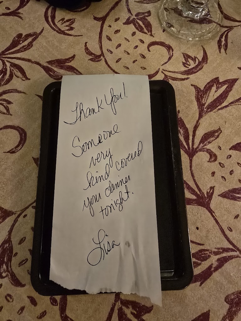 I took my severly disabled son there for dinner. Our server Lisa was very kind. She recommended the ravioli with beef medallions. It was very good. She brought me extra rolls for the sauce. At the end of my meal when the bill came there was this note in there. Lisa said someone covered my meal. I was so touched by it I didnt know what to say. She wouldn't tell me who paid it. Some kind person there. I cannot tell you how much of a great night this was for me. I am truly thankful.