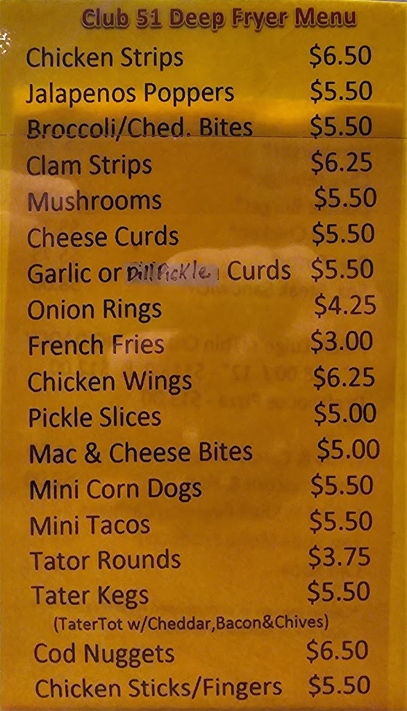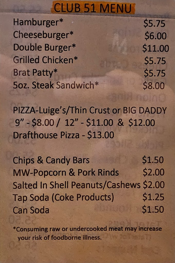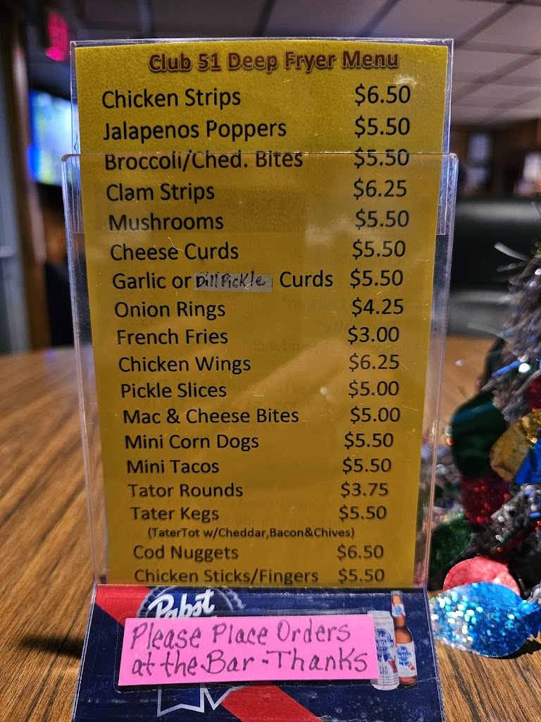 This bar has been here a long time. I think it's been 40 years since I was last in Club 51. I don't think it's been updated in 40 years either. Still a fun hangout and an interesting group of locals to interact with. Really good burgers and the cheese curds were really good too. Will be back.