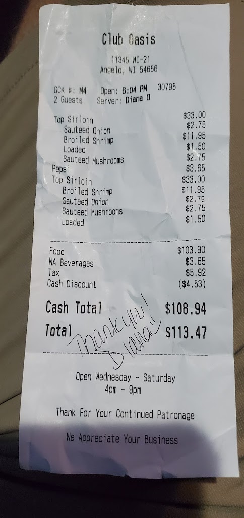 Fantastic fish fry and great service! Compliments to Joshua (owner/Manager?) for the wonderful hospitality. We travel from MN to take my Grandpa out to eat at Club Oasis and Joshua always makes us feel welcome and special! Thank you Club Oasis!