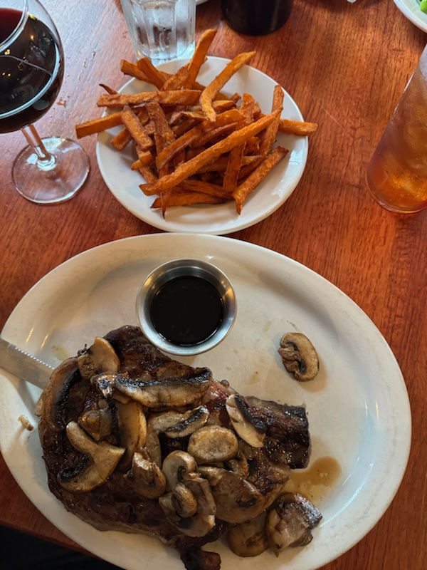 Excellent ribeye steak. Definitely the place to go if you on your last day of TDY and wanting to treat yourself. Good for large groups.