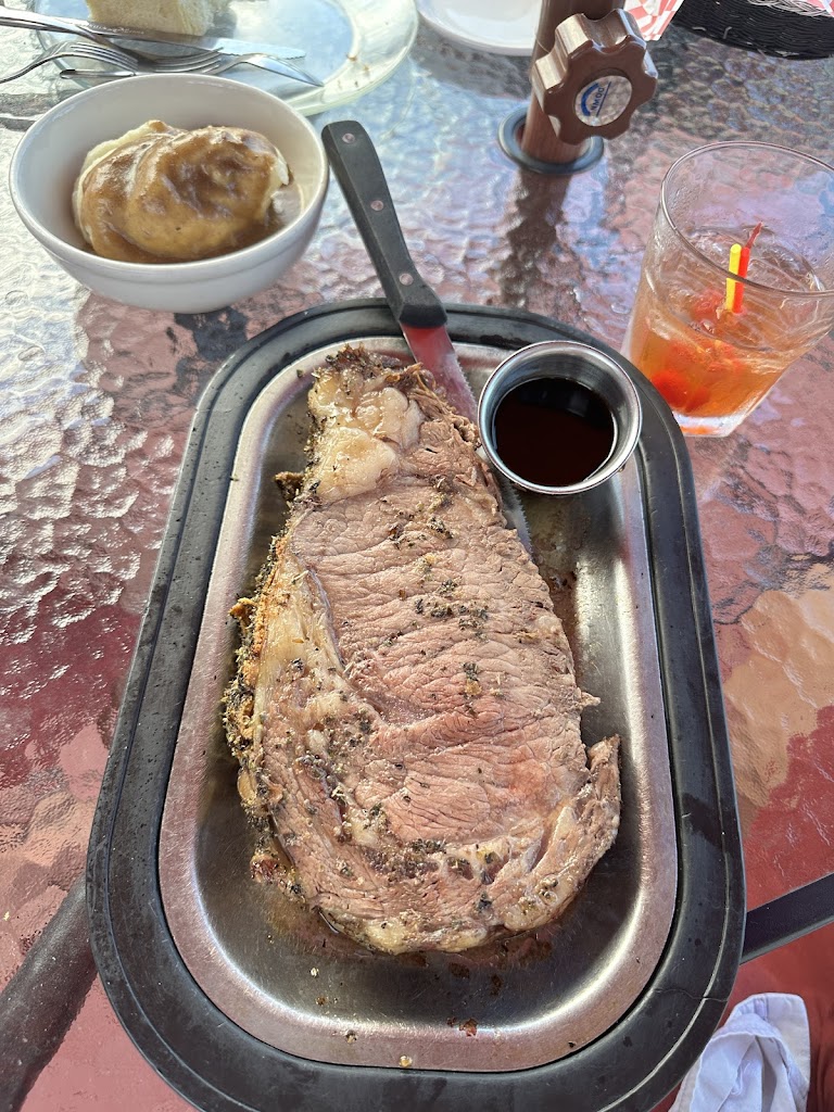 Service fantastic. Salad bar was excellent. However the Primerib was disappointing. Not very tender and very little flavor even with the au jus. Au Gratin potatoes were dry and tasted reheated. Had the same experience the last time we ate primerib here but was willing to give it another try just in case it was a bad loin. Would definitely go back for the salad bar but would need to order a different entrée