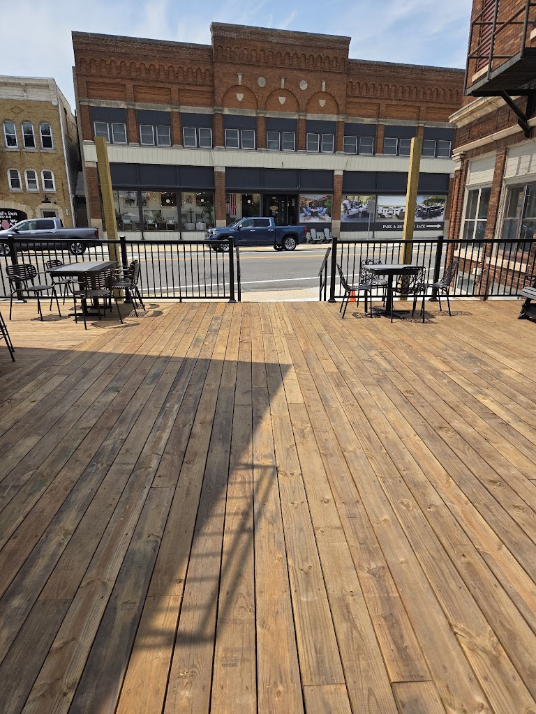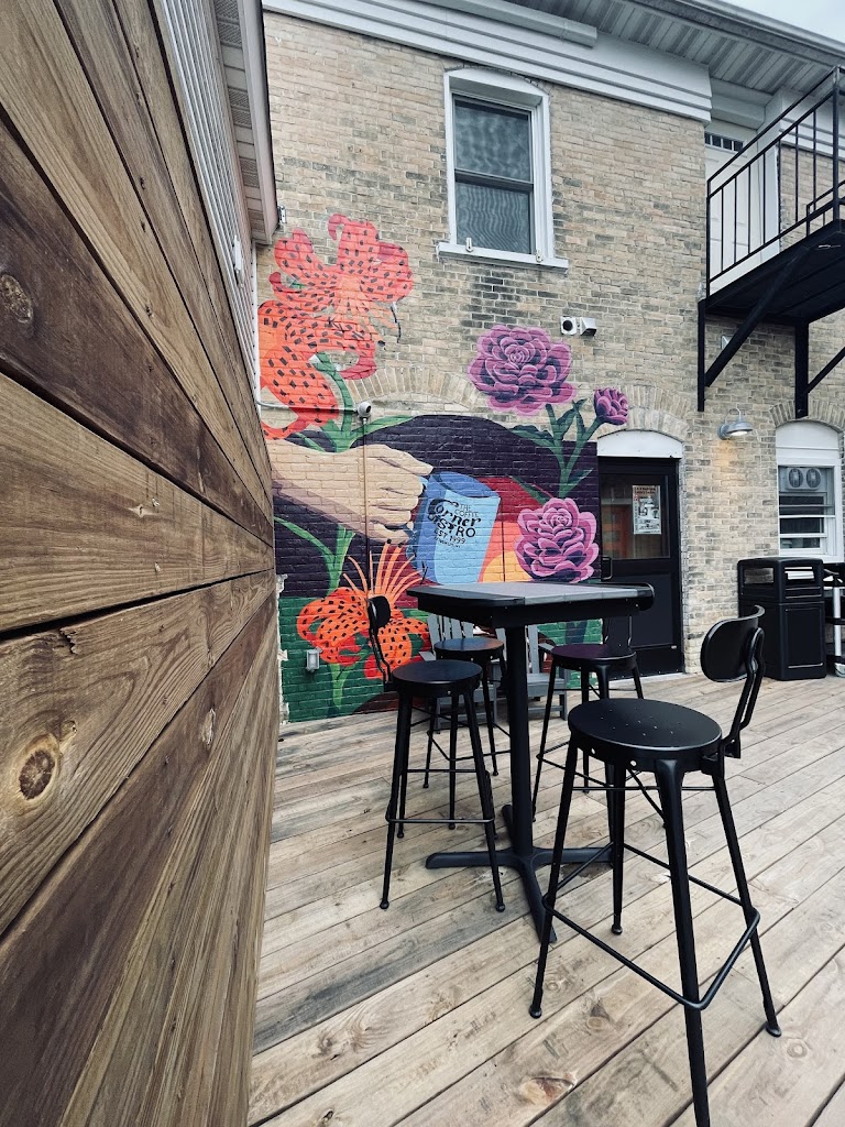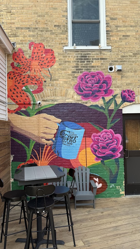 Corner shop indoor and outdoor seating area. Perfect for a quick stop. Friendly service and nice coffee shop atmosphere which is so NOT Starbucks.