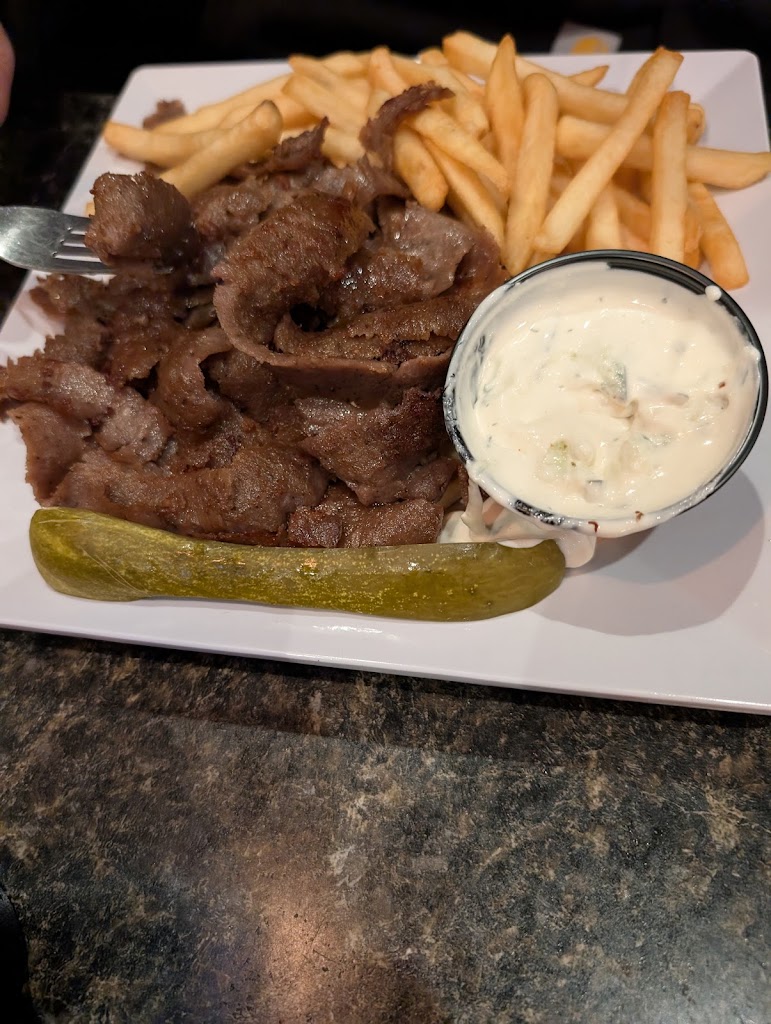 Gyro wasn't fresh of the spit. It was warmed by the grill. Had a fry sear