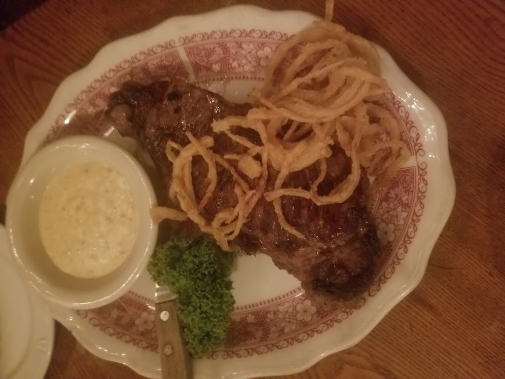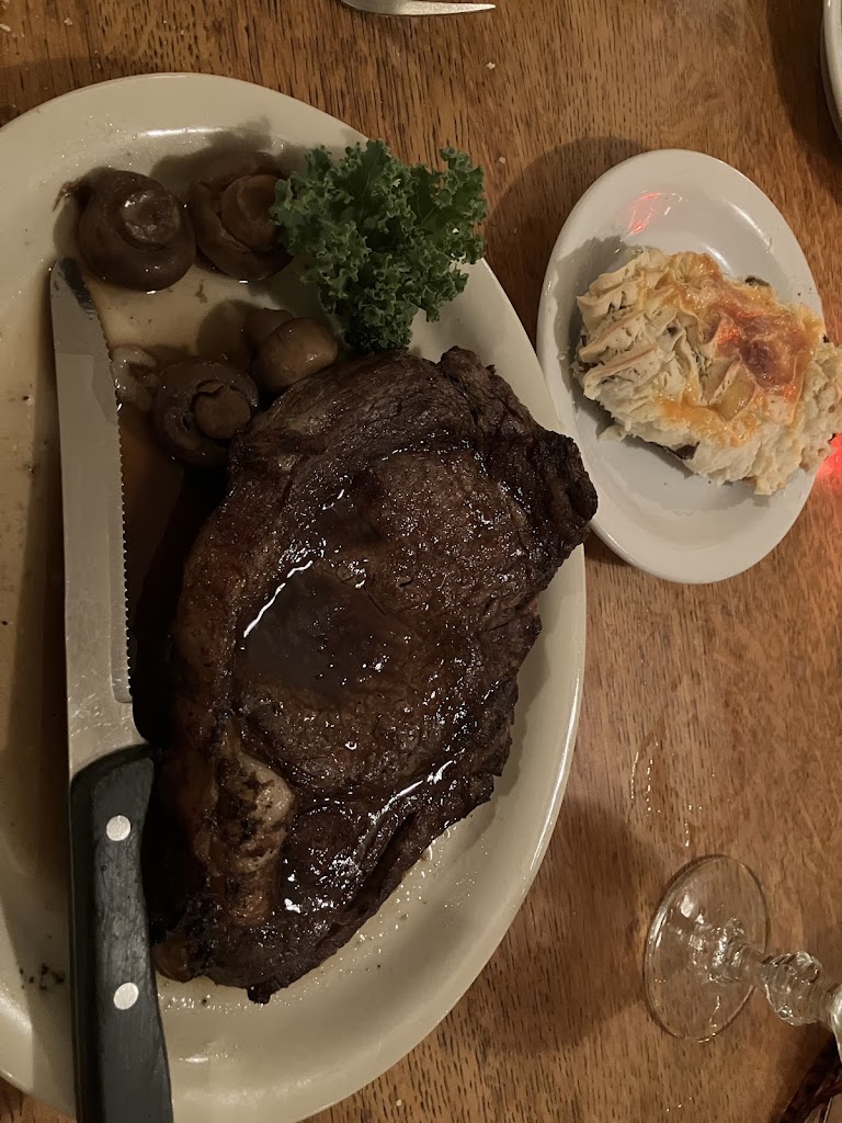 Food was a good value. Soup and salad came with dinner. Soup was good but far too much dressing on the salad. Ribeye steak was good. Twice baked potato was rather bland. Service was excellent. Our server had a great sense of humor and all staff was very attentive. Nice dining room but very loud due to wood floors.