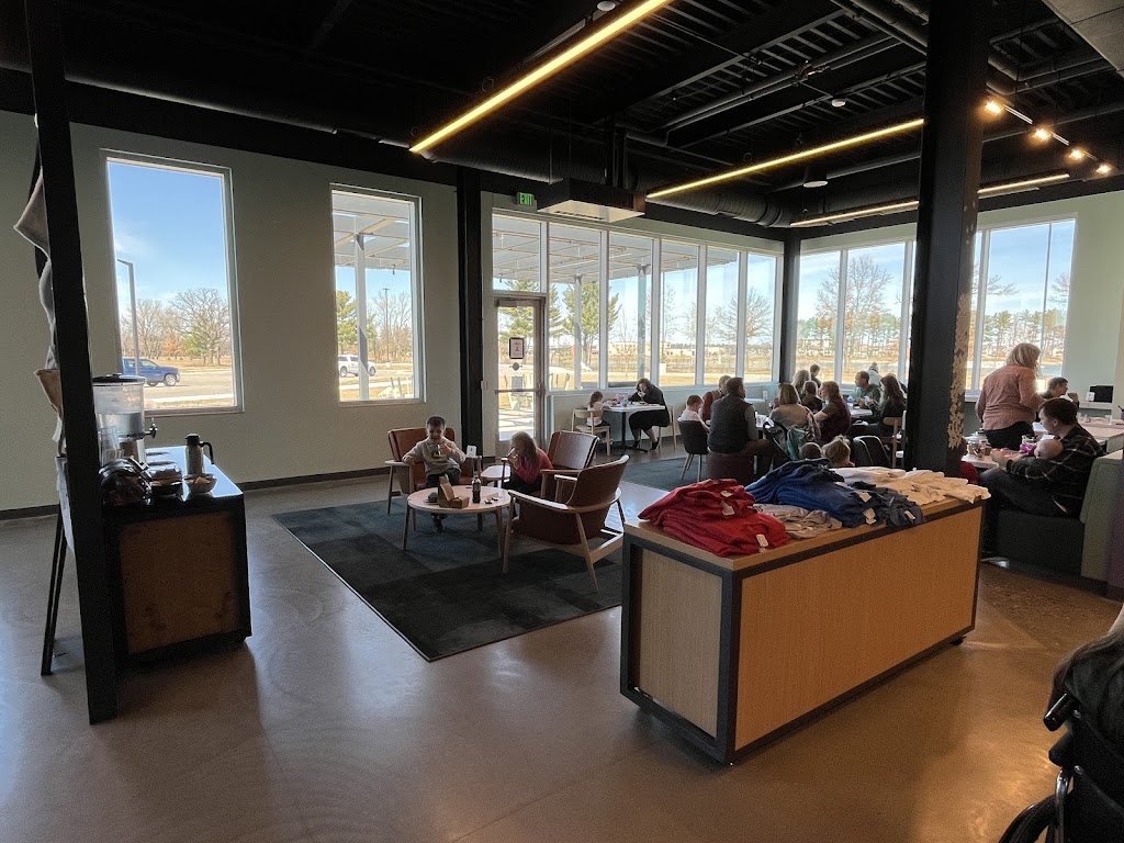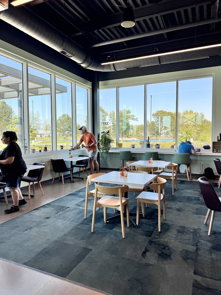 great space in plover, off the road, but nice big area for dining, hanging out, reading a book, outdoor tables, nice place for kids, its inside the food and farm center, that looks like an interactive center for farming and events place. they have breakfast sandwiches and lunch sandiwiches, great coffee, lattes, tea, artisan soda’s and mimosas. casual, no lines. Can’t bring outside food.