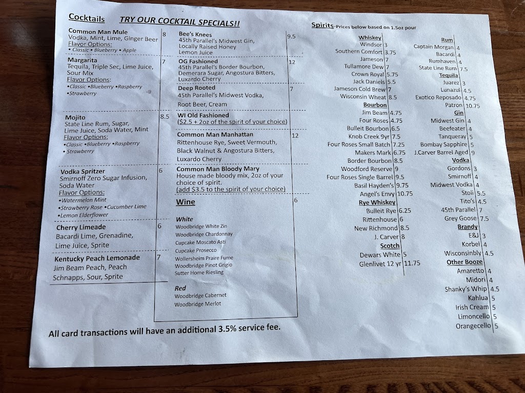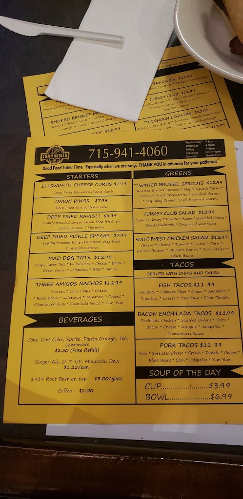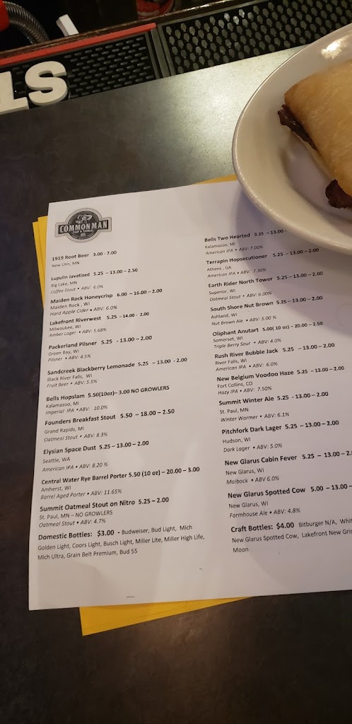What fun....spent the night at David Lodge in Ellsworth WI prior to my first fly-fishing lesson. The owner recommended Common Man...not many other places to go, so we did. What a pleasant visit. The staff were welcoming and fun. The food was super, and the beer, while not a local microbrewery, was excellent with a selection from nearby and afar. We had a great evening...