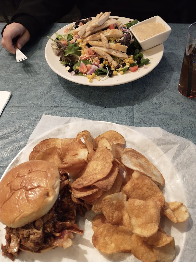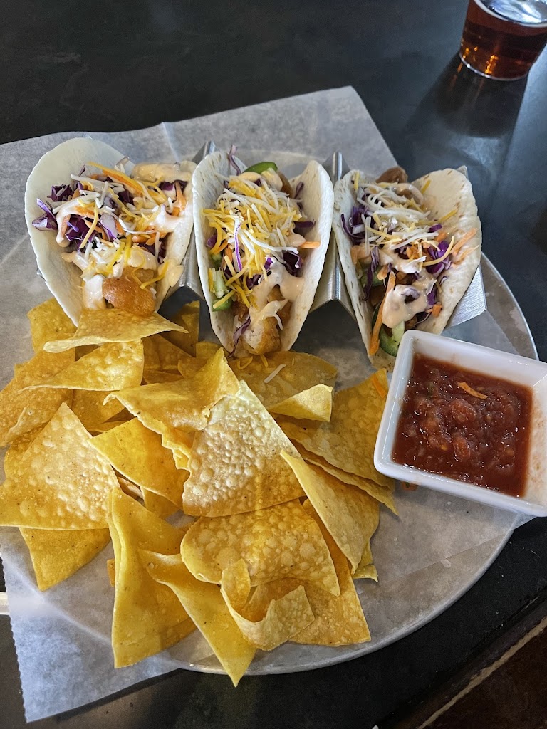 We started off with cheese curds, which were served in a tall cone. The curds were fantastic, crisp, chewy, and squeaky. We added an order of ranch on the side, and I was really impressed by it; our server said it was house-made, too. For my main dish, I had the chicken enchiladas tacos. Now, I'm from California, and I look at any Midwest takes on Mexican food with a critical eye, but these were really good tacos! My husband had the maple whiskey burger and really enjoyed his meal. I sneaked one of his fries and found it to be delicious.