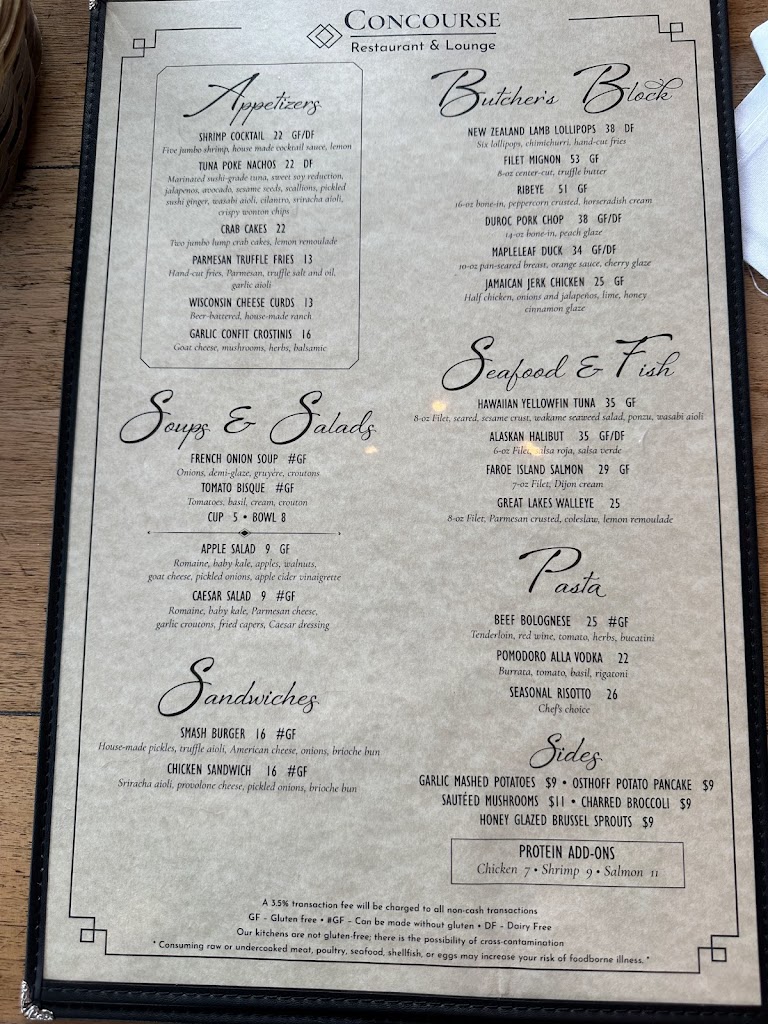 We are visiting from Texas and had dinner at Concourse. On our way to the restaurant we met their new Chef who started just this month. He is from Florida and seems to be eager to showcase his flavors. All I told him was I like my food spicy. When I came into the restaurant I was welcome promptly and the server was phenomenal. She asked the right questions and if she didn’t know the answer was very frank about it. I ordered the Cajun pasta and asked for it to be spicy. When we got the food the pasta had the right spice and absolutely flavorful. Every bite was enjoyable and paired with Pinot Noir was delicious. I would definitely visit the restaurant again during this visit.