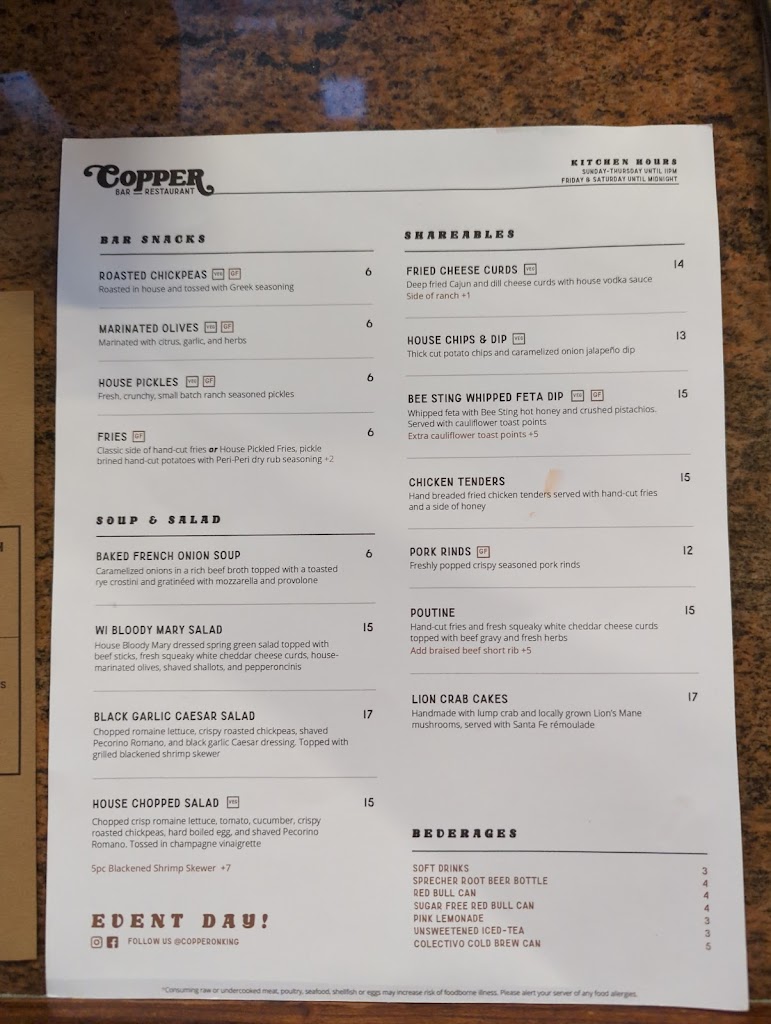 OK, so hear me out. At first glance, you might think Copper's is just another restaurant with a similar menu. It is not! The food is not only exceptional, they have managed to put an international spin on very familiar things. If you're in Milwaukee, just go and see for yourself. You'll find American food with Mediterranean, French and even Creole influence, and their menu is expanding even more in the next week or two! I cannot wait to go back. I may make a special trip to Milwaukee just to see what they do next.