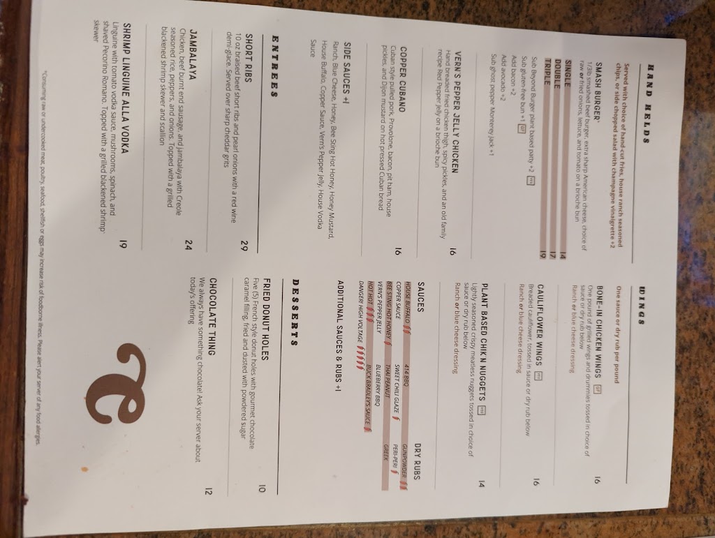 A friend and I ate here in the early afternoon of June 14. It was our first time at Copper on King. As it was a lovely day, we ate outside in the deck they built into the street. We both ordered the smash burgers with salad instead of fries. My balsamic dressing had red pepper flakes in it (who does that?) which made it exceptionally hot for my palate. The burger was fine - at 1/3 lb it big enough to satisfy. It was rather well cooked (more than medium, less than burned) The lettuce and tomato rested atop one side of the bun while the meat and cheese were on the other, which meant the lettuce and tomato were not steamed to death. We both had iced tea. The first glass was rather weak, but we were then brought a pitcher which was, if not great, much better than the initial drink. Service was good and friendly. I would return to try other menu options. The closest paid lot had decided to charge event pricing ($35) so we found a more reasonable lot up the street. The restroom was clean and well stocked.