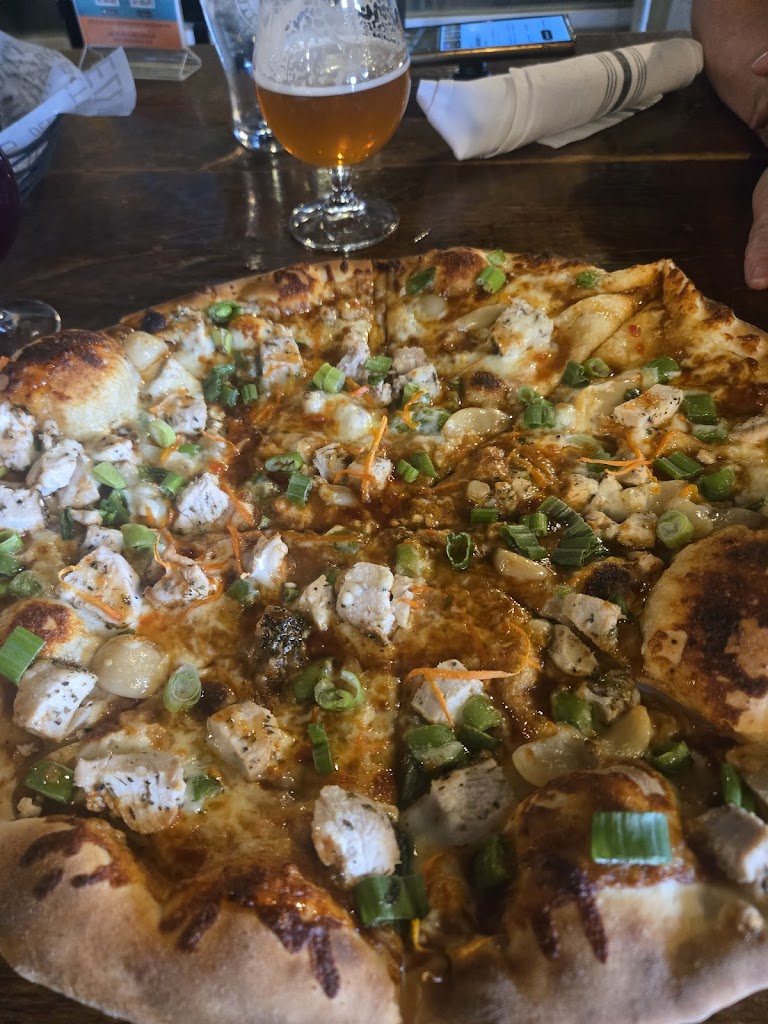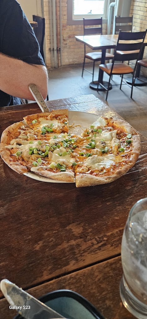 Went here for a little dinner while in Green Bay. We didn’t want the bar seating, so there is a side room with some tables. Nice and quiet for us, perfect. Was visited by a couple different super friendly servers, we came at shift change I think. All were more than willing to get drinks and help out with questions. Got a pretzel and beer cheese and ordered a flight of their limited beers. The pretzel is huge, and so delicious. The beer cheese definitely isn’t out a can either. Had a nice beer flavor with a little funk, not like one we’ve had before. The beers were all good, and I would say they were all the rated abv, if not more. So I just stuck with the flight, so I wasn’t wasted. Order a WoodFord pizza, which was cooked to perfection. Have had a lot of half done/raw woodfire pizza, this is not one. Crust was a perfect brown, done underneath to the middle, cheese and meat cooked nicely, not a haeavy sauce either, nice fresh tomato flavor. I’d eat that pizza twice a week if I lived there. Outstanding brewery experience. Server was a A+ as well.