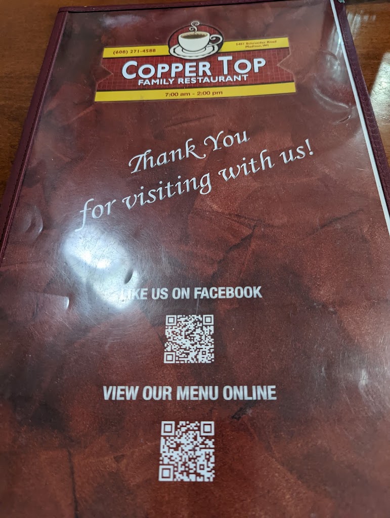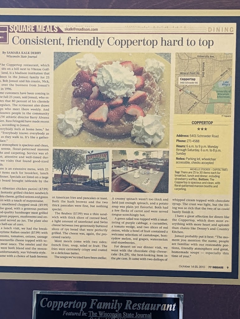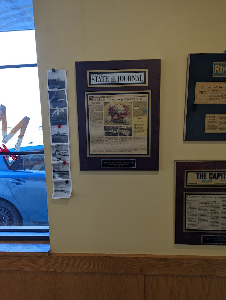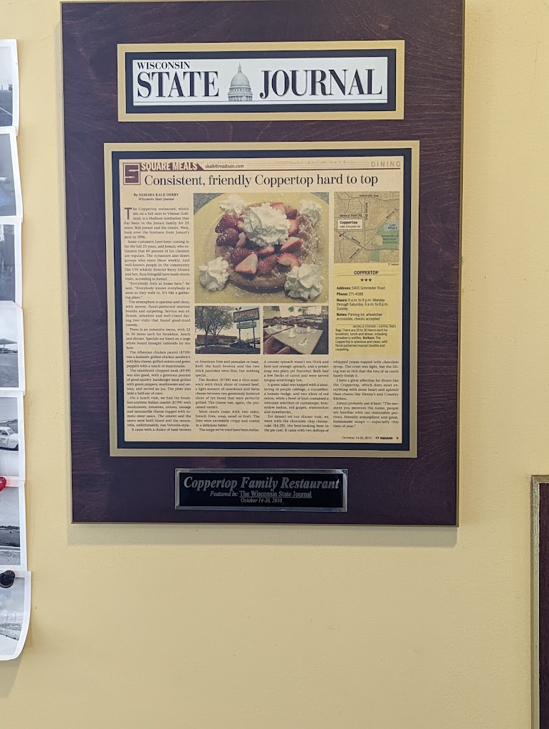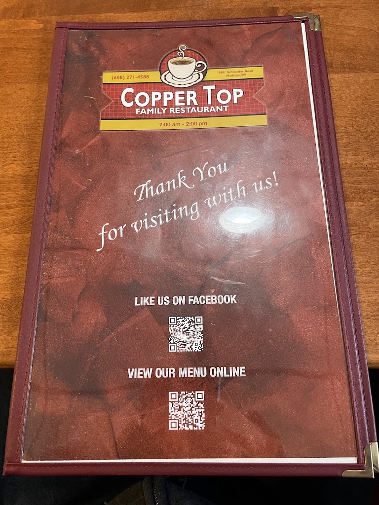 I wish I took a picture of our breakfast.This place has been around for a long while, and has history in Mad City. I highly recommend Copper Top Restaurant.Great food, great prices and great staff.