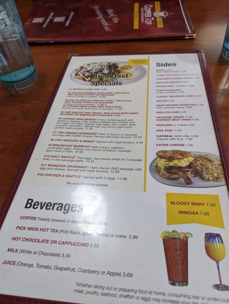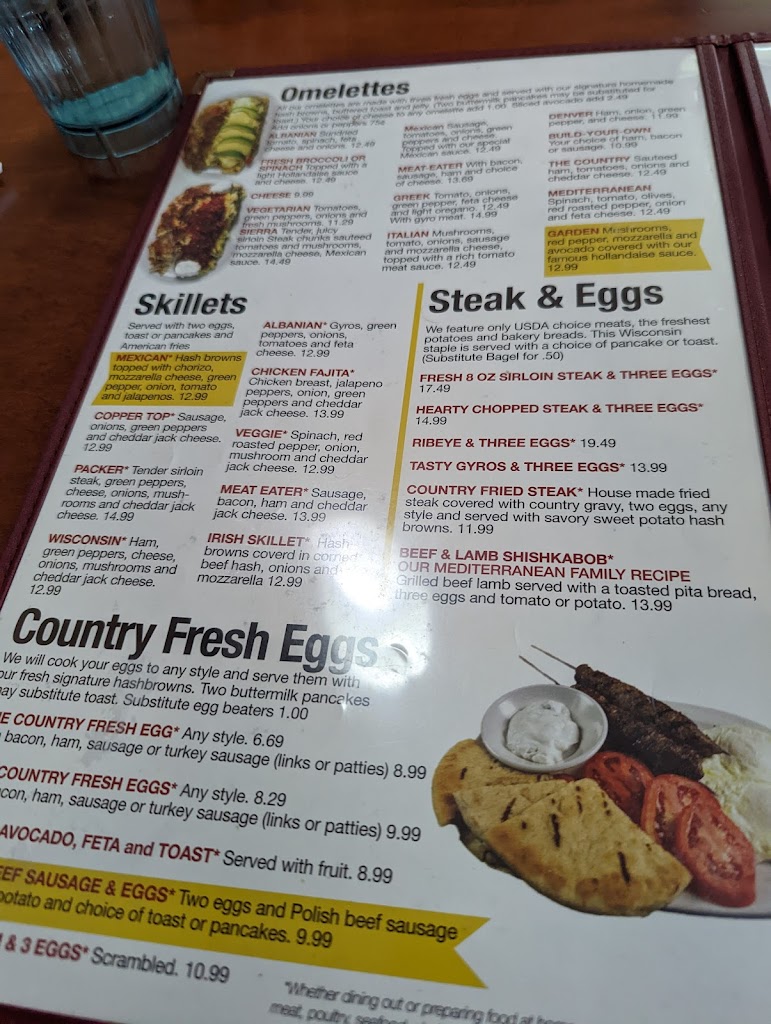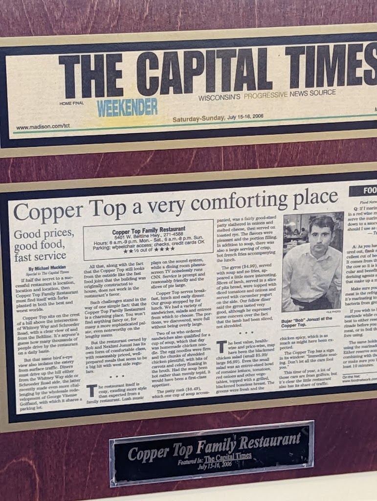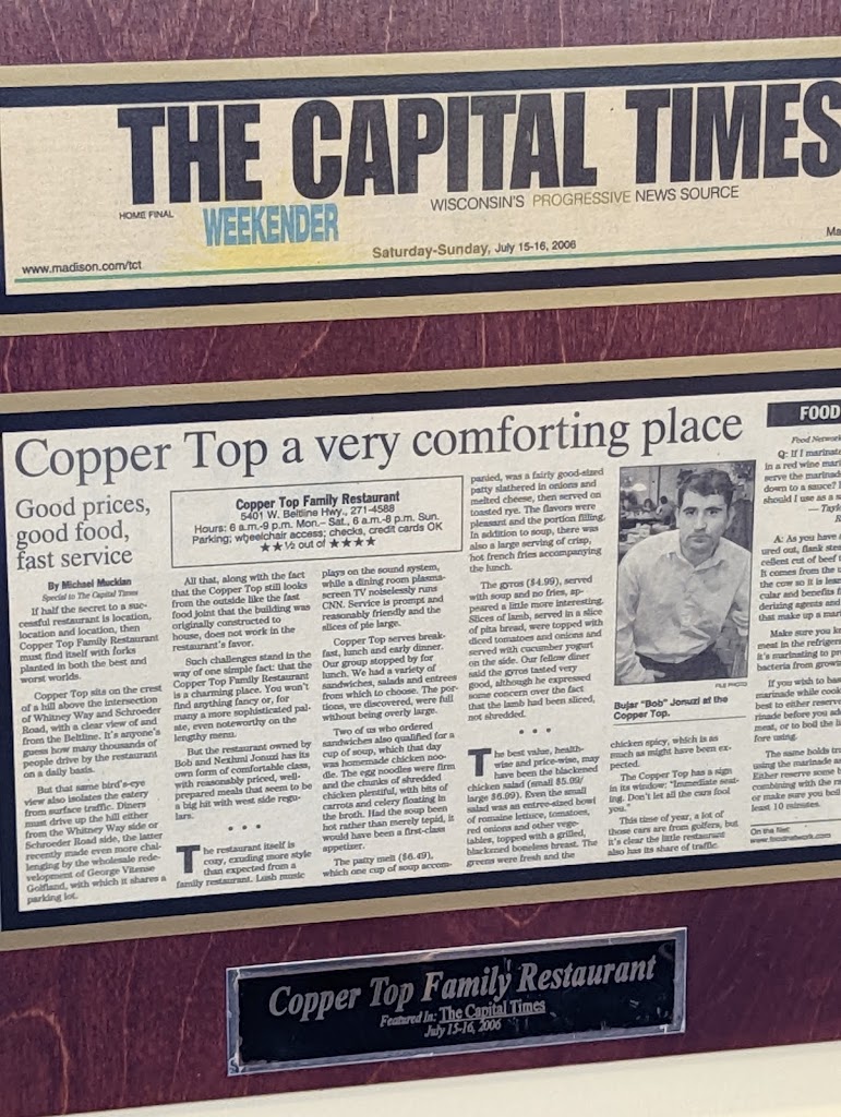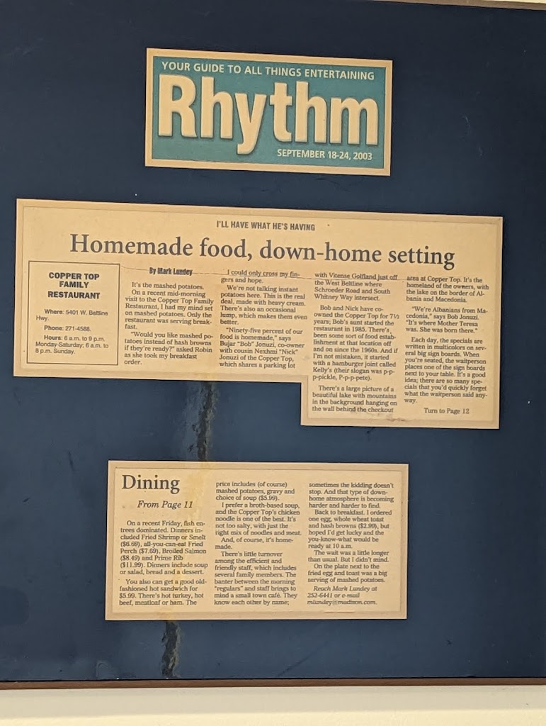 I wish I took a picture of our breakfast.This place has been around for a long while, and has history in Mad City. I highly recommend Copper Top Restaurant.Great food, great prices and great staff.